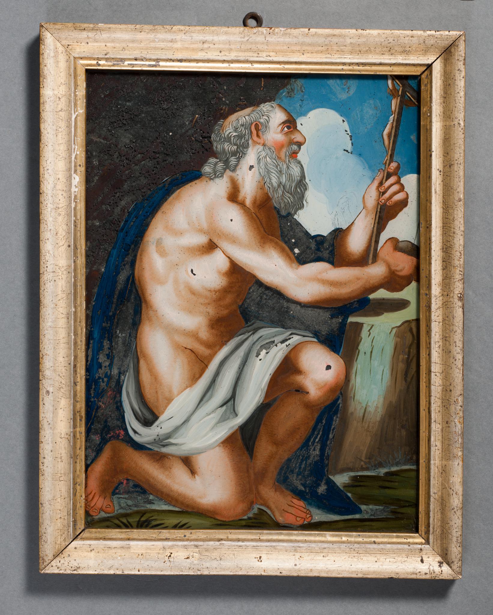 Das Hinterglasgemälde übernimmt seitenrichtig, aber stark vereinfacht eine Radierung (Florenz, Kunsthistorisches Institut in Florenz, Max-Planck-Institut, Inv.-Nr. 95576) von Agostino Carracci (Bologna 1557–1602 Parma). Die Radierung wurde in Augsburg von Christian (1708–1781) und Philipp Rugendas (1736–1807) kopiert und als Schabkunstblatt in Blaudruck gedruckt (Rugendas 1998, S. 143, Kat.-Nr. 211). Der Hinterglasmaler verzichtete bei der Umsetzung auf den links oben erscheinenden Löwenkopf und auf den vor grossen Felsformationen und Baumstrünken hingelegten Kardinalshut unten rechts. Er beschränkte sich auf die Selbstkasteiung des Eremiten, der sich gemäss Legende zur Abtötung weltlicher Begierden mit einem Stein auf die Brust schlug. Es ist sehr wohl möglich, dass bereits ein seitenverkehrter Stich mit dem vereinfachten Bildmotiv existierte, der als Vorlage gedient haben könnte. Dies würde erklären, wieso das Hinterglasbild seitenrichtig erscheint. Allerdings ist diese Vorlage bisher nicht bekannt.