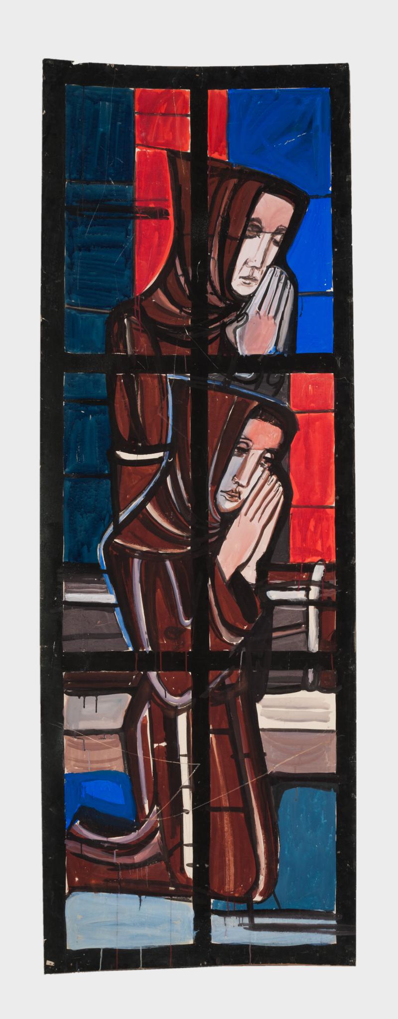 Le carton représente deux moines agenouillés, les mains jointes en prière, aux pieds d’un lit sur lequel on aperçoit les jambes d’un corps étendu sur un lit (saint Antoine). Les deux moines, tournés vers la droite, portent une robe de bure brune avec la capuche relevée sur leur tête. Celui du haut a les yeux fermés. Ils se détachent sur un fond rouge, bleu et gris. La surface du carton est divisée en six parties correspondant aux panneaux du vitrail réalisé.