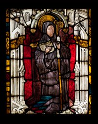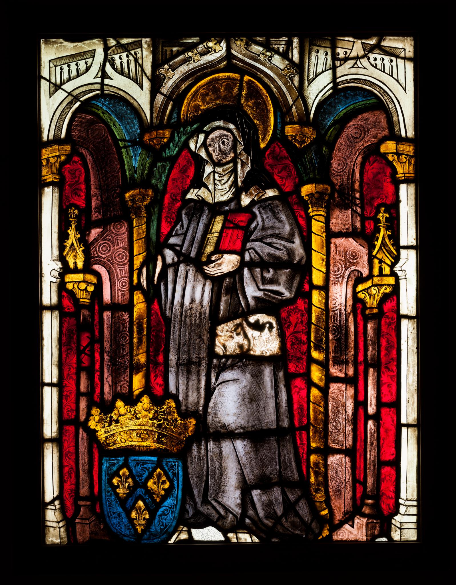 Vitrail au plomb représentant sainte Scholastique dans un encadrement architectural. La sainte, auréolée, de pieds et tournée vers la gauche, est vêtue de l’habit monastique bénédictin (tunique mauve et voile noir ourlé de blanc). Elle tient un rameau de palmier dans sa main droite et un livre à la couverture rouge dans sa main gauche. Aux pieds de la sainte figurent les armoiries de la famille royale française (d’azur à trois fleurs de lis d’or, timbré de la couronne royale). La sainte est placée dans un tabernacle (deux arcs en plein cintre sur les côtés, un arc surbaissé au centre, soutenus par des colonnes), sur un sol en damier blanc à peine visible. Les voûtes sont en bleu, étoilées et bordées de vert. Les ouvertures des arcatures sont remplies d’un damassé rouge.