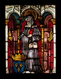 Les bandes latérales de part et d’autre du panneau représentant saint Benoît ont été ajoutées ultérieurement, mais sont composés de fragments de vitraux anciens (Beer, 1965, p. 197). Les lacs d’amour, insignes de la Maison de Savoie (voir N°inv. 198) appuie l’hypothèse selon laquelle la commanditaire du vitrail est Yolande de France, épouse d’Amédée IX de Savoie.