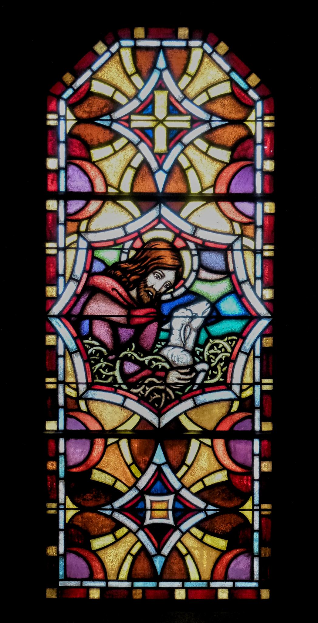 Vitrail composé de trois panneaux. Au centre d’un encadrement ornemental coloré, dans un médaillon octogonal : le Christ en buste et de trois quarts sauve un agneau pris au piège dans des ronces.