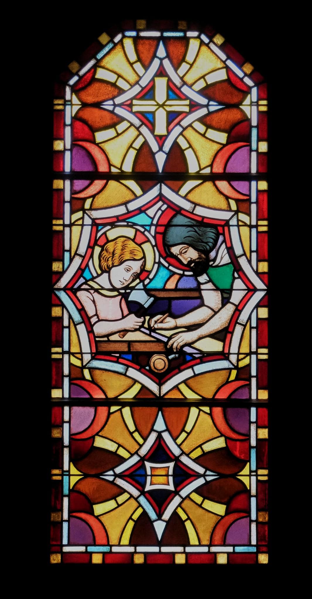 Vitrail composé de trois panneaux. Au centre d’un encadrement ornemental coloré, dans un médaillon octogonal : à droite, Joseph est penché au-dessus d’un établi sur lequel est posée une planche de bois, qu’il marque de sa main droite avec un crayon. A gauche, Jésus tient une hache dans sa main droite et regarde ce que fait son père.