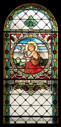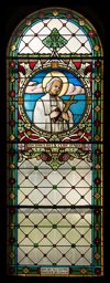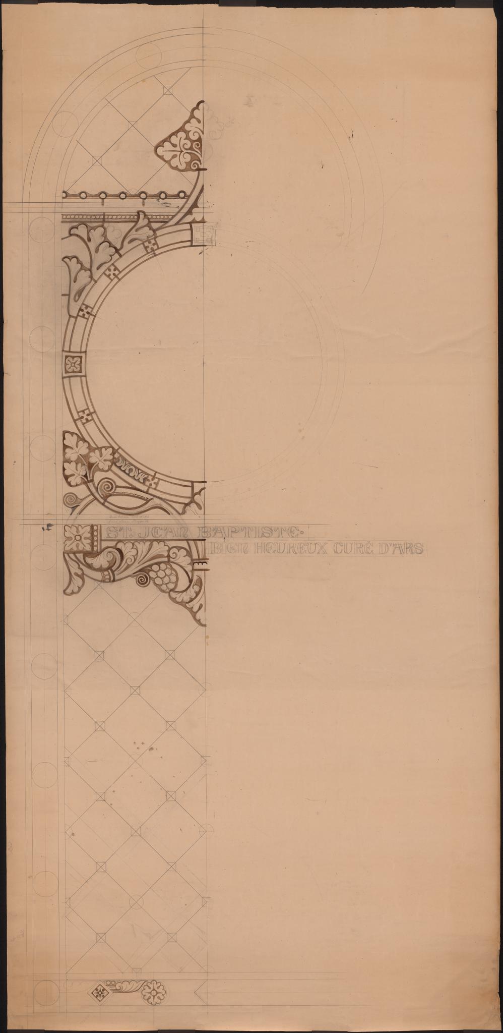 Seule la partie gauche de l’encadrement ornemental des deux vitraux consacrés à saint Jean-Baptiste et le Bienheureux curé d’Ars de la façade occidentale est dessinée dans les moindres détails. Elle est composée d’un grand médaillon dans sa partie supérieure entourée d’une fine bordure avec une ornementation végétale importante et un fond à losanges. Le nom du saint figure sur un cartouche sous le médaillon.