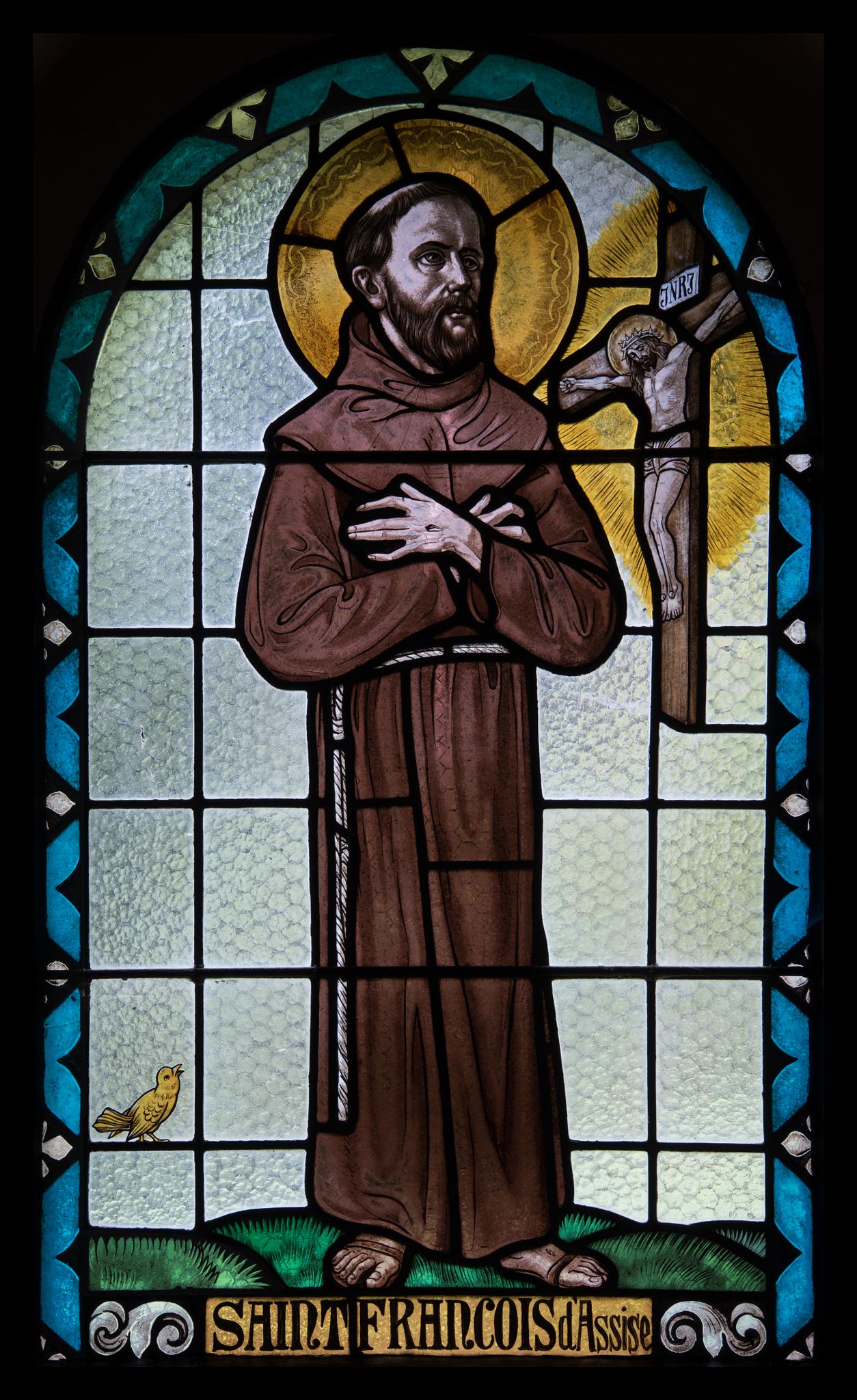 Ce vitrail consacré à saint François d’Assise se situe dans la troisième fenêtre à gauche dans la nef de la chapelle Notre-Dame-de-la-Brillaz à Prez-vers-Noréaz. Ce petit sanctuaire, lieu de pèlerinage local, est édifié en 1926-1927 par l’architecte fribourgeois Léon Hertling (Lauper, 2012, p. 240). Douze petits vitraux ornent l’ensemble des fenêtres. C’est l’artiste-architecte Jean Crivelli (trois maquettes pour cette chapelle issues du Fonds graphique de l’atelier Kirsch & Fleckner KF_122, KF_162 et KF_163 sont signées de ses initiales JC) et l’atelier fribourgeois Kirsch & Fleckner qui en sont les auteurs. Le cycle date de la construction du bâtiment en 1927 (le vitrail de sainte Cécile est signé et daté en bas à droite : KIRSCH et FLECKNER / FRIBOURG . 1927.).