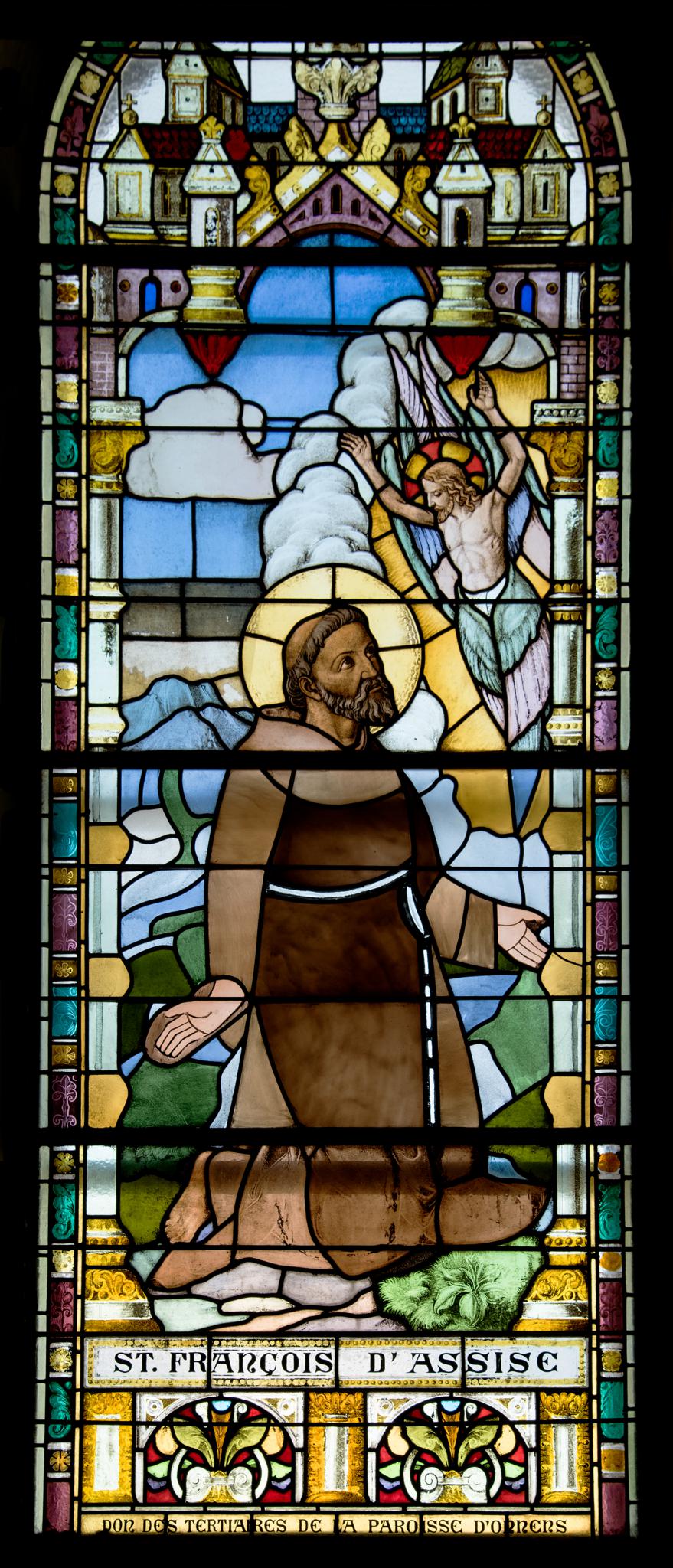 Ce vitrail consacré à François d’Assise se situe dans la première fenêtre à gauche dans la nef de l’église Saint-André à Onnens.