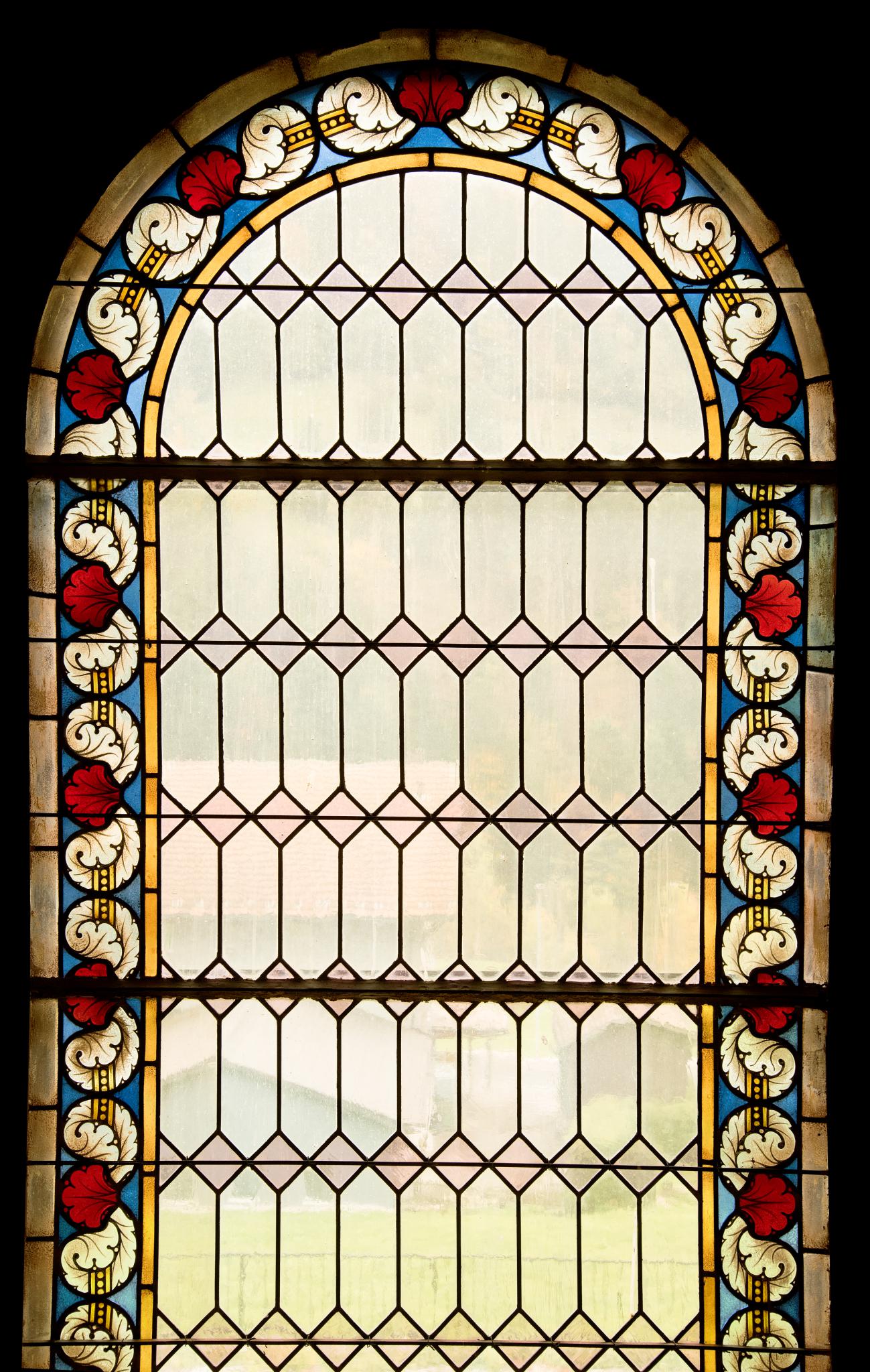 Ce vitrail ornemental se compose de bornes à verres clairs encadrées d’une bordure colorée composée d’éléments végétaux (dont des feuilles d’acanthes) et géométriques.