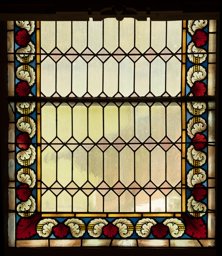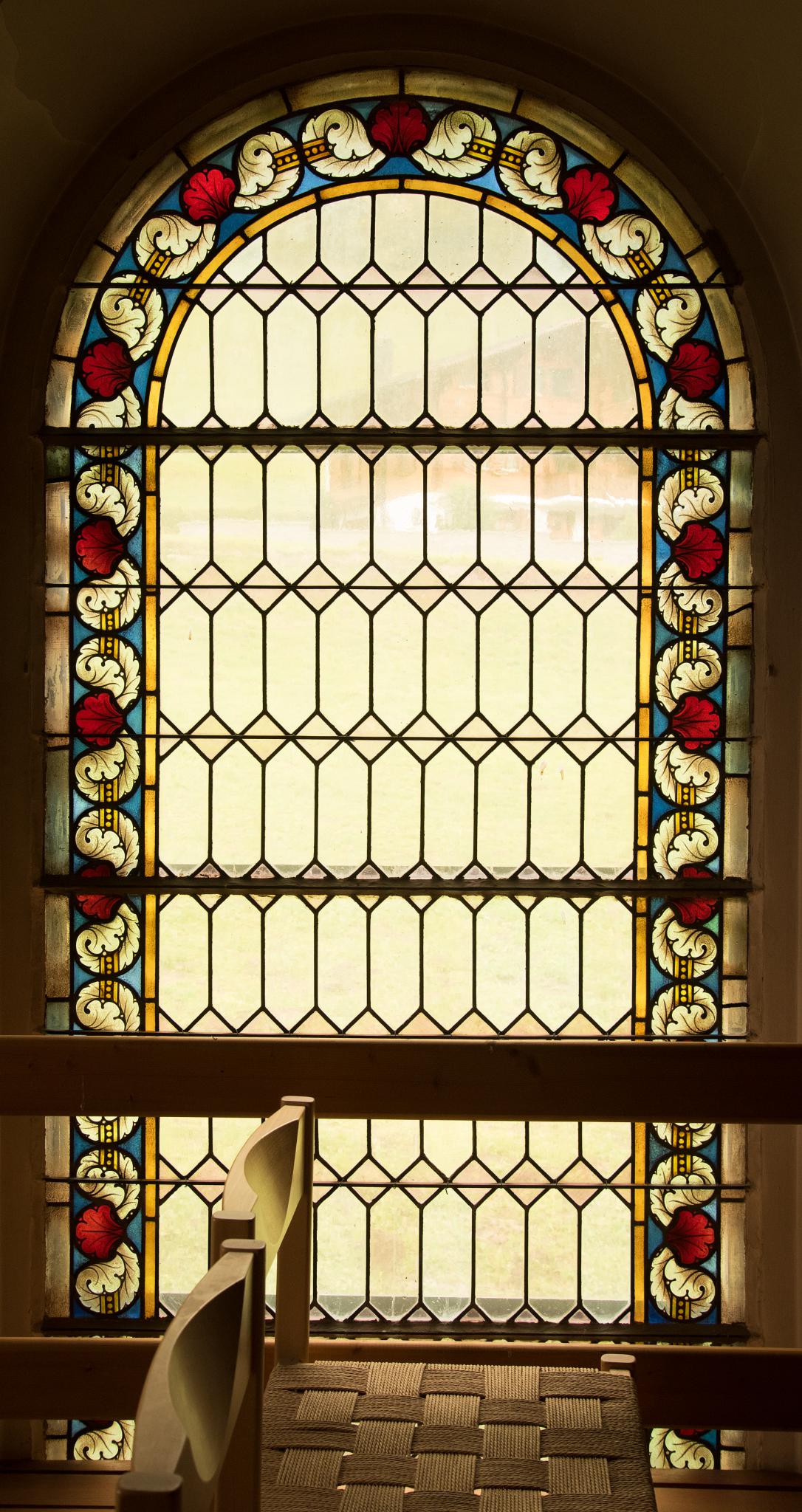 Ce vitrail ornemental se compose de bornes à verres clairs encadrées d’une bordure colorée composée d’éléments végétaux (dont des feuilles d’acanthes) et géométriques.