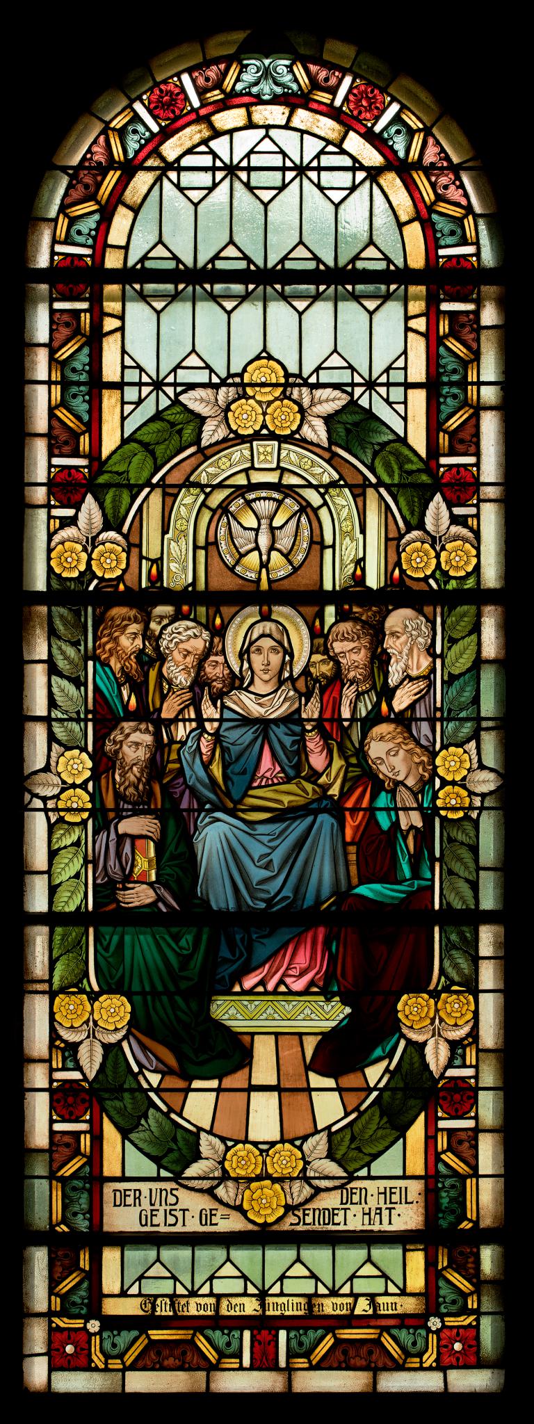 Au centre du vitrail se trouve une scène narrative dans un médaillon oblong : la Vierge, assise au centre, tient ses bras ouverts devant elle. Douze apôtres sont assis autour d’elle. Ils portent tous la barbe à l’exception de Jean assis au premier plan à droite qui est imberbe. Des langues de feu tombent sur les têtes de chacun des apôtres alors que la colombe du Saint-Esprit descend sur la Vierge.