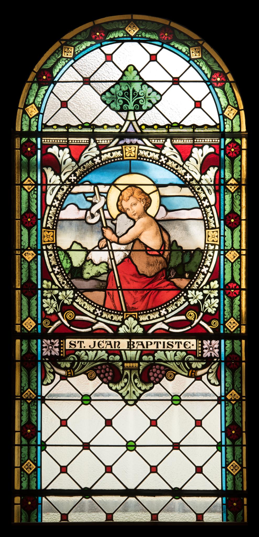 Au sommet de ce vitrail ornemental, se trouve un médaillon dans lequel saint Jean-Baptiste est figuré à mi-corps. Présenté de trois-quarts, il tient sur ses genoux un agneau et de sa main gauche un bâton cruciforme au sommet duquel flotte un étendard. Derrière lui, des arbres.