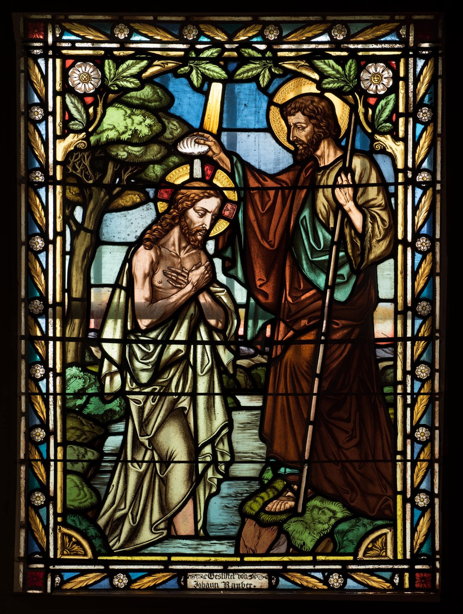 Le Christ, debout les pieds dans le Jourdain, a les mains croisées sur sa poitrine. A droite sur la rive, Jean-Baptiste, debout et de profil, le baptise de sa main droite. De sa gauche, il tient un bâton cruciforme. Des rayons lumineux tombent sur le Christ. A l’arrière-plan se dessine un paysage avec un grand pin à gauche. Deux branches de rosier avec fleurs et feuilles dessinent une arcature en plein cintre au-dessus de la scène.