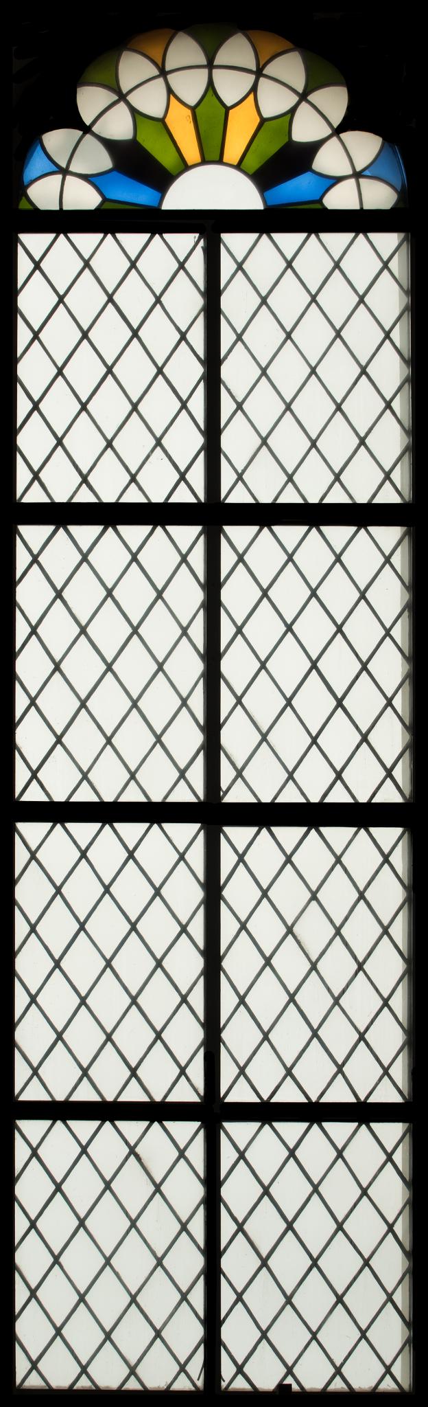 Verrière en plein cintre à losanges composée de verres blancs avec dans la partie supérieure une demi-fleur géométrique multicolore.