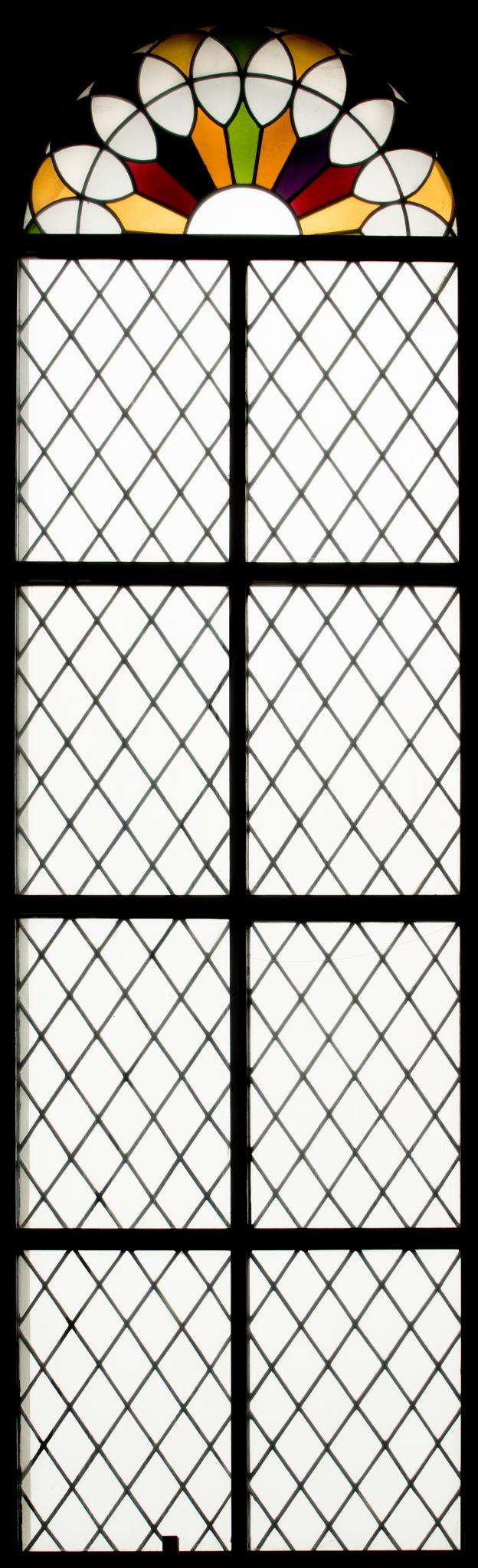 Basées sur le même dessin que les fenêtres à losanges de la nef, il existe encore neuf fenêtres incolores réparties entre le porche et le choeur.