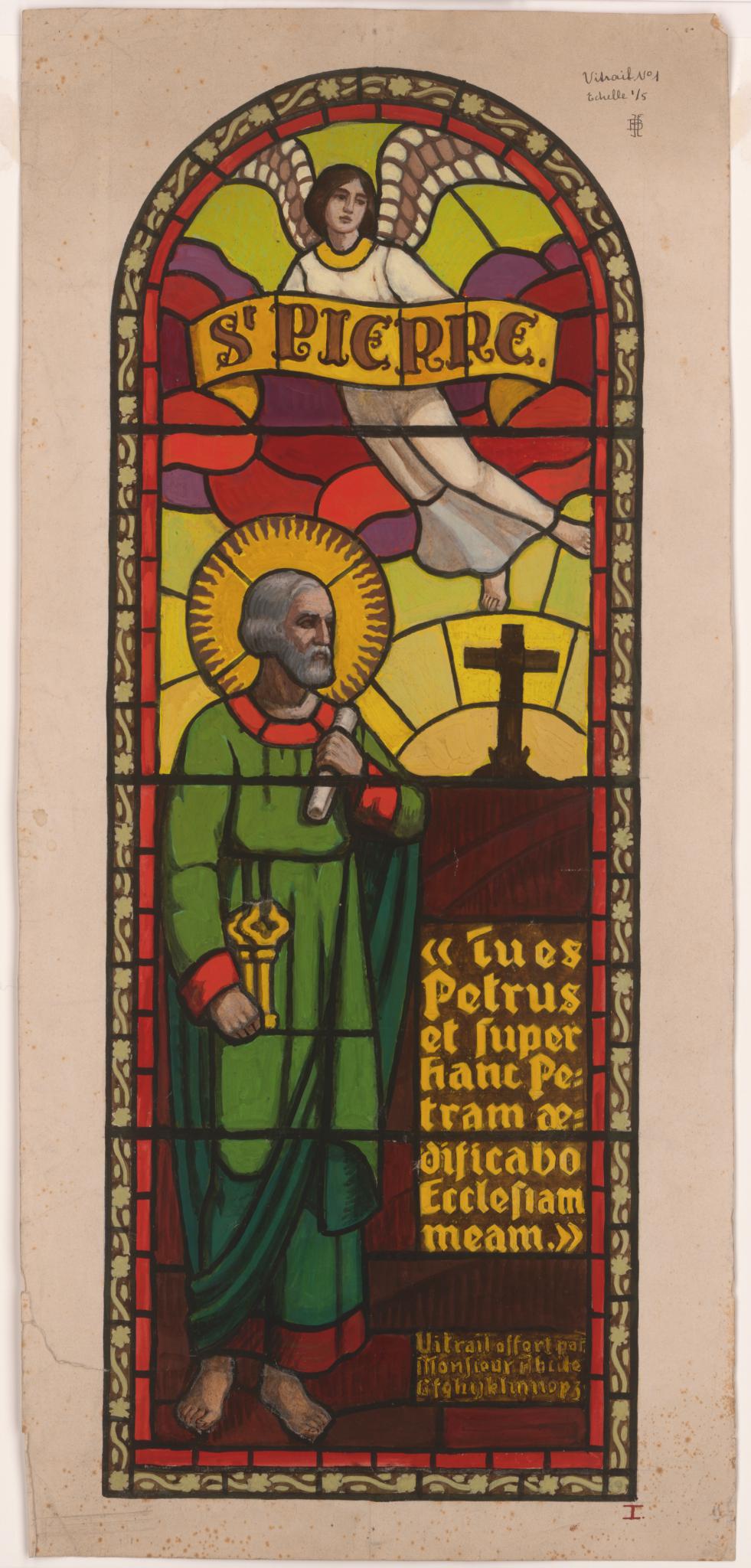 Cette maquette en couleur est un dessin détaillé à l’échelle 1:5 pour le vitrail consacré à saint Pierre situé à droite dans le choeur de l’église Saints-Pierre-et-Paul à Villars-sur-Glâne.