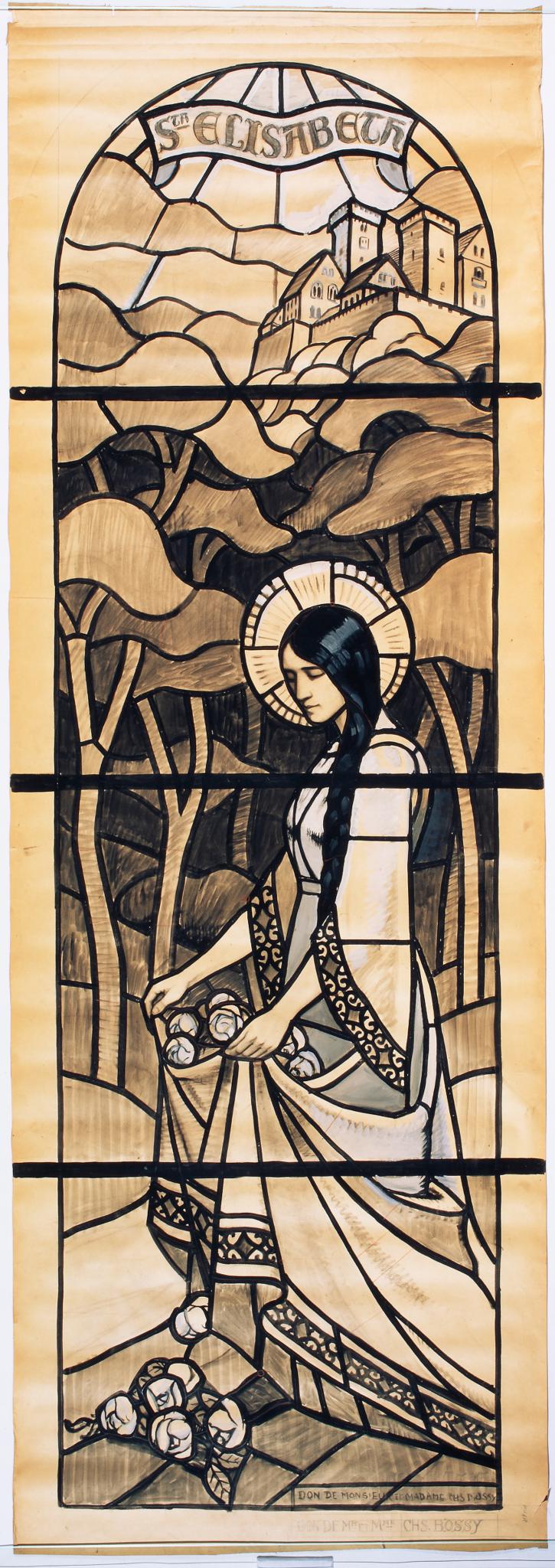 Ce carton est le modèle noir et blanc précis à l’échelle 1:1 du vitrail consacré à sainte Elisabeth pour la troisième fenêtre du transept gauche de l’église Saints-Pierre-et-Paul à Villars-sur-Glâne. Seule la double bordure manque. Sur le vitrail en haut, dans un phylactère le nom de la sainte “STA ELISABETH” est inscrit, et en bas dans un cartouche cette inscription : “DON DE MR ET MME CHS. BOSSY.”.