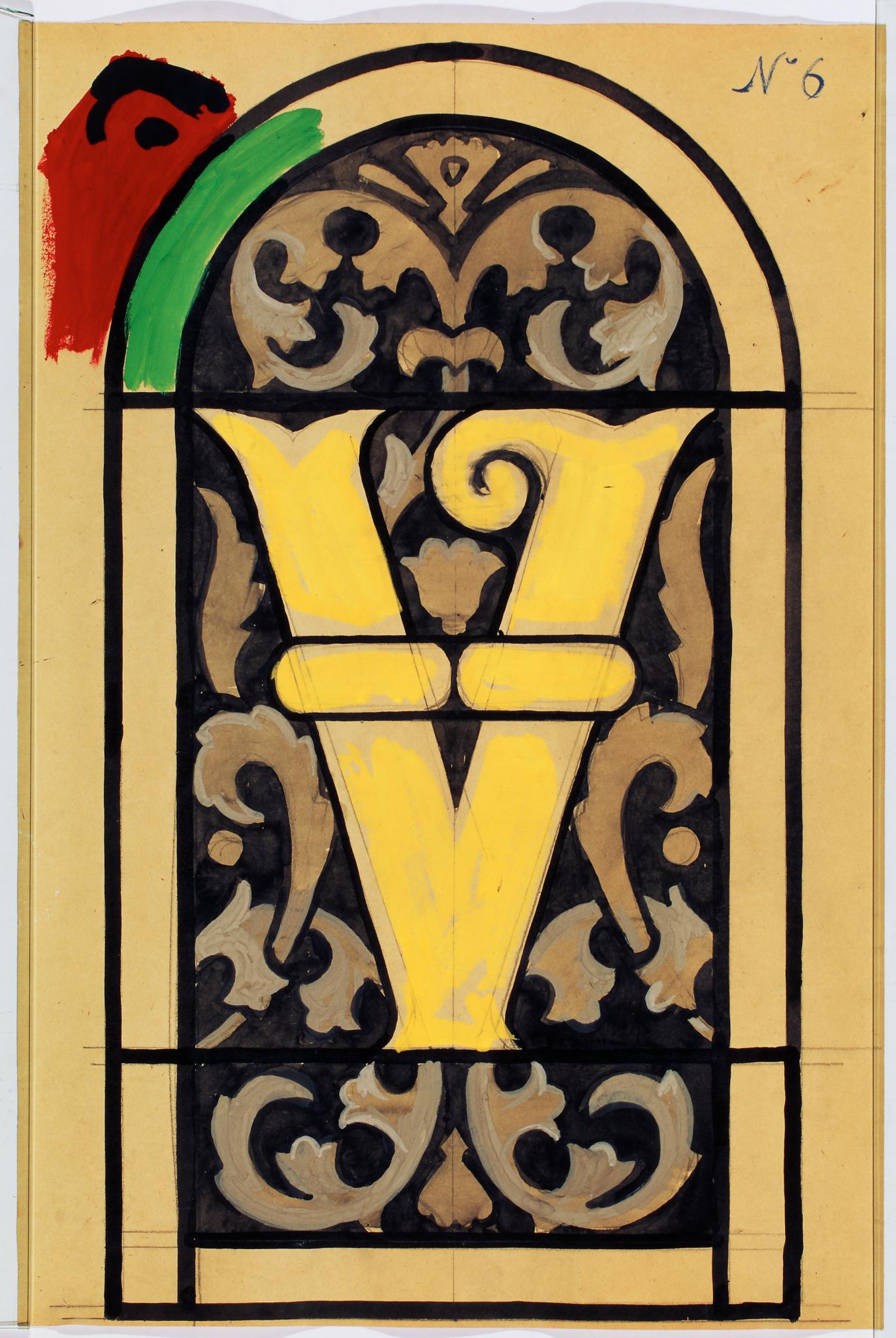 Ce carton est le modèle couleur précis à l’échelle 1:1 du petit vitrail illustrant la sixième des dix lettres composant les mots latins “panis vivus” (pain vivant) situé au-dessus des trois fenêtres du choeur de l’église Saints-Pierre-et-Paul à Villars-sur-Glâne. Aujourd’hui l’ensemble des ces dix petits vitraux a été déposé pour laisser place à des fenêtres à bornes.