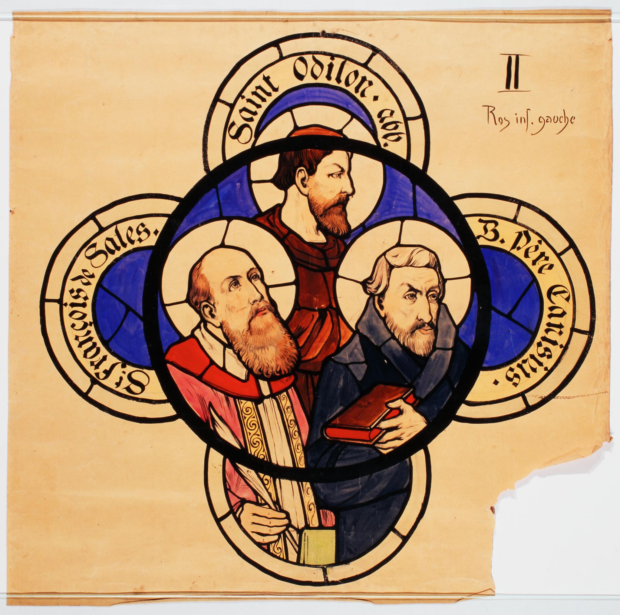 Ce carton en couleur à l’échelle 1:1 est le projet définitif pour le quadrilobe inférieur gauche du vitrail du transept à droite de l’église Saint-Martin de Cugy, sur le thème : “Je crois en la communion des saints”. Cette fenêtre comprend deux autres quadrilobes dans lesquels sont représentés la Trinité et la Vierge et saints Nicolas de Myre, Charles Borromée et sainte Catherine (Pasquier, 1999, p. 24-25).