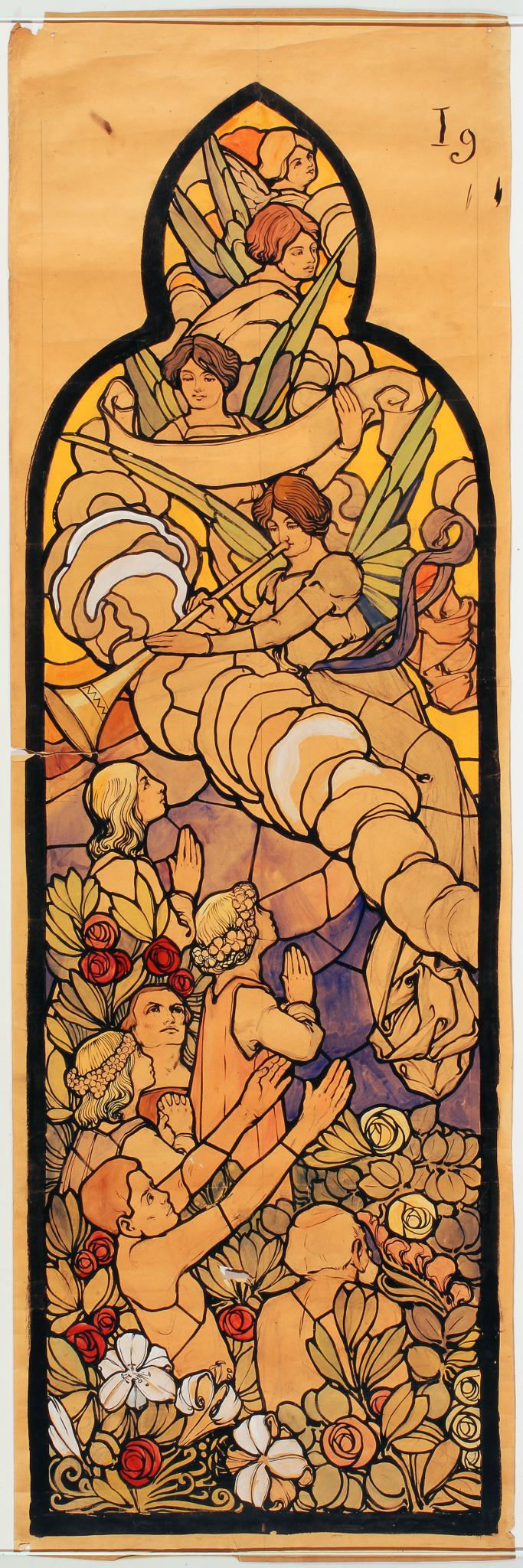 Ce carton en couleur à l’échelle 1:1 est le projet définitif pour la lancette de gauche du vitrail du transept à gauche dans l’église Saint-Martin de Cugy sur le thème “Je crois la résurrection de la chair”.