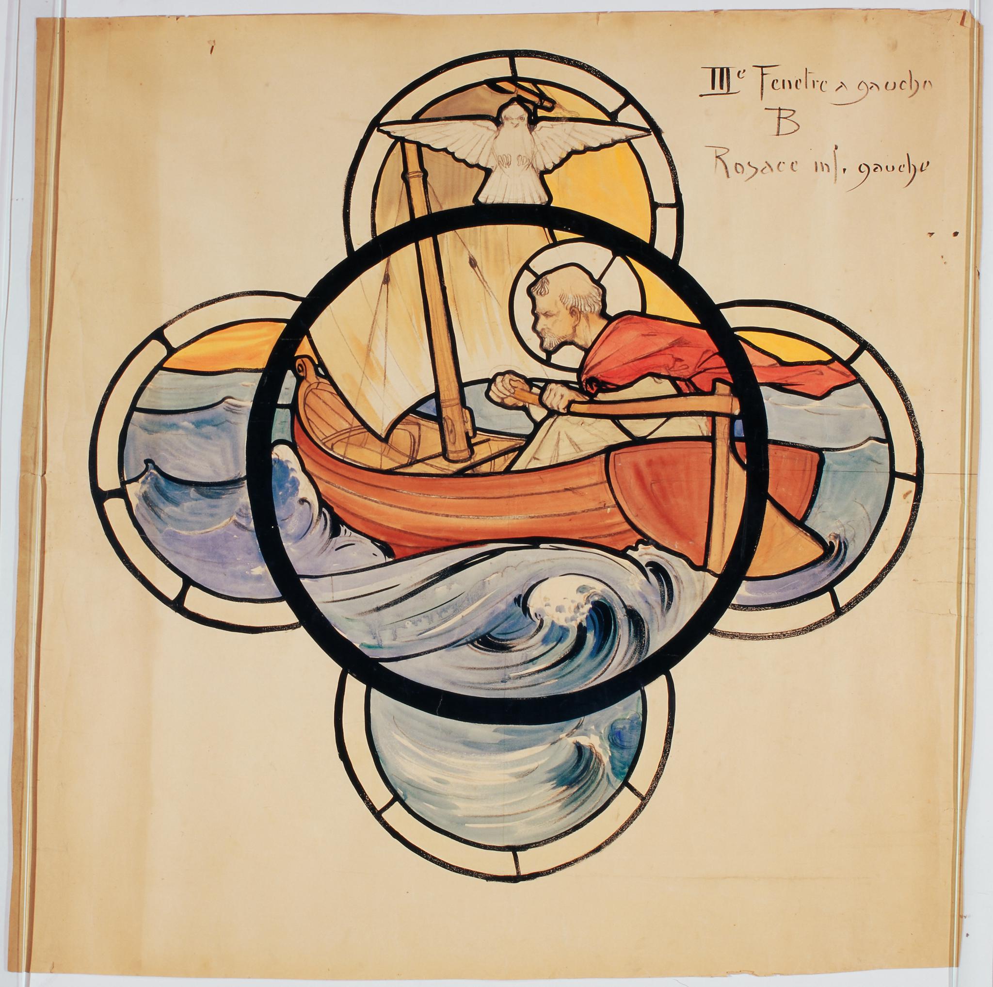 Ce carton en couleur à l’échelle 1:1 est le projet définitif pour le quadrilobe inférieur gauche de la verrière de la troisième travée à gauche de la nef de l’église Saint-Martin de Cugy, dédiée au thème “Je crois en la sainte Eglise catholique”. Cette fenêtre comprend deux autres quadrilobes dans lesquels sont représentées la basilique Saint-Pierre de Rome et la Pentecôte (Pasquier, 1999, p. 21-23).