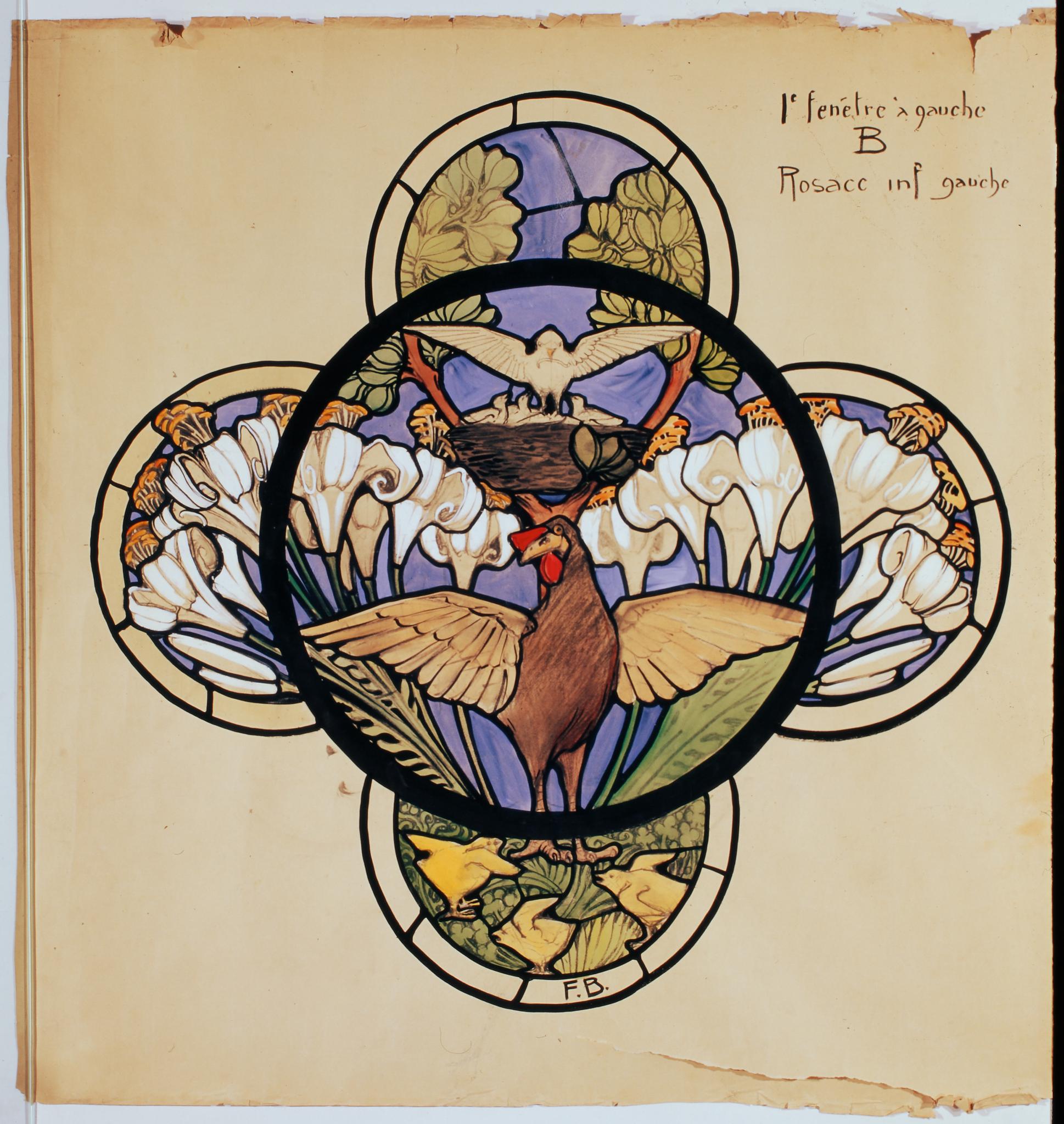 Ce carton en couleur à l’échelle 1:1 est le projet définitif pour le quadrilobe inférieur gauche de la verrière de la première travée à gauche dans la nef de l’église Saint-Martin de Cugy, dédiée au thème “Je crois en la providence de Dieu”. Cette fenêtre comprend deux autres quadrilobes dans lesquels sont représentés Dieu le père gouvernant le monde et la Providence sous la forme d’un ange gardien (Pasquier, 1999, p. 11-14).
