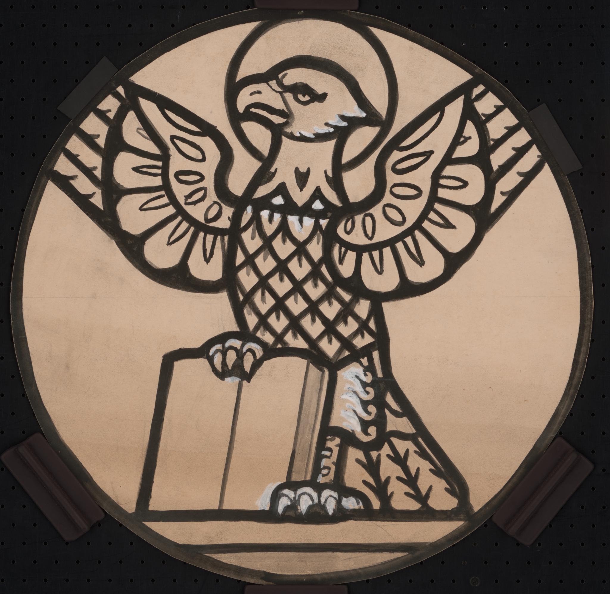 Ce carton en noir et blanc est le modèle précis à l’échelle 1:1 du symbole de l’évangéliste Jean (aigle) inscrit dans un oculus pour la partie supérieure du second vitrail à droite dans la nef de la chapelle Sainte-Anne à Sommentier.