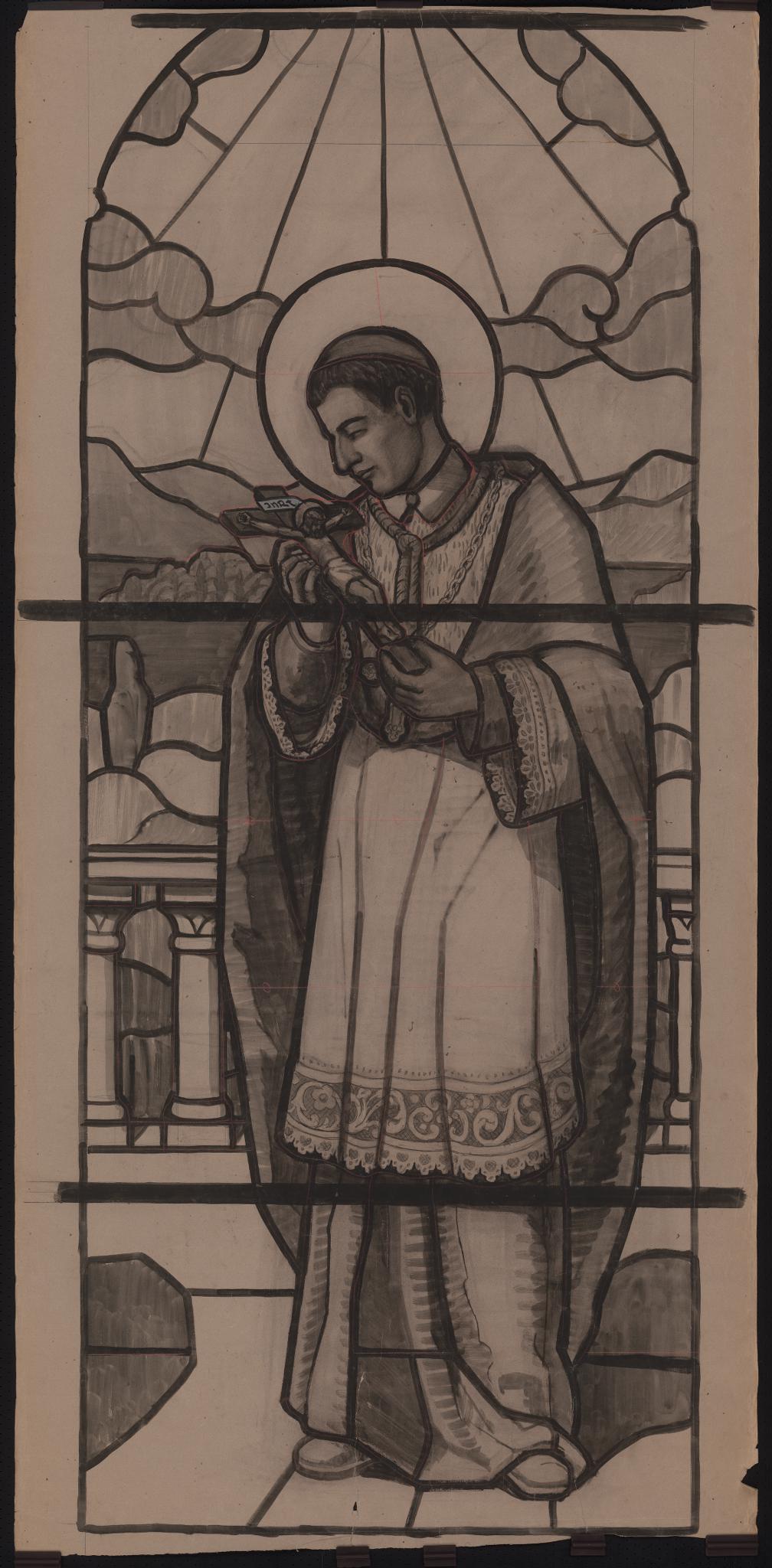 Ce carton est le modèle noir et blanc précis à l’échelle 1:1 de la partie figurée consacrée à saint Charles Borromée pour la quatrième fenêtre à droite dans la nef de l’église Saints-Pierre-et-Paul à Villars-sur-Glâne.