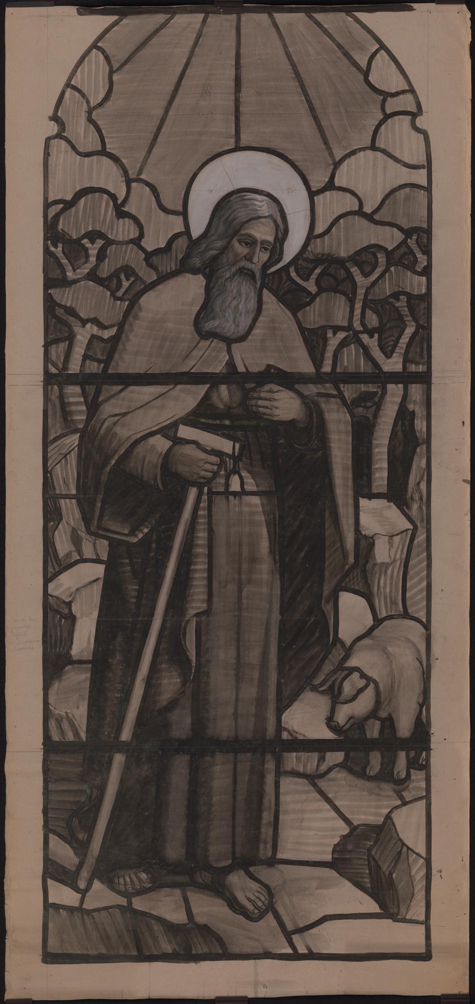 Ce carton est le modèle noir et blanc précis à l’échelle 1:1 de la partie figurée consacrée à saint Antoine pour la deuxième fenêtre à gauche dans la nef de l’église Saints-Pierre-et-Paul à Villars-sur-Glâne.