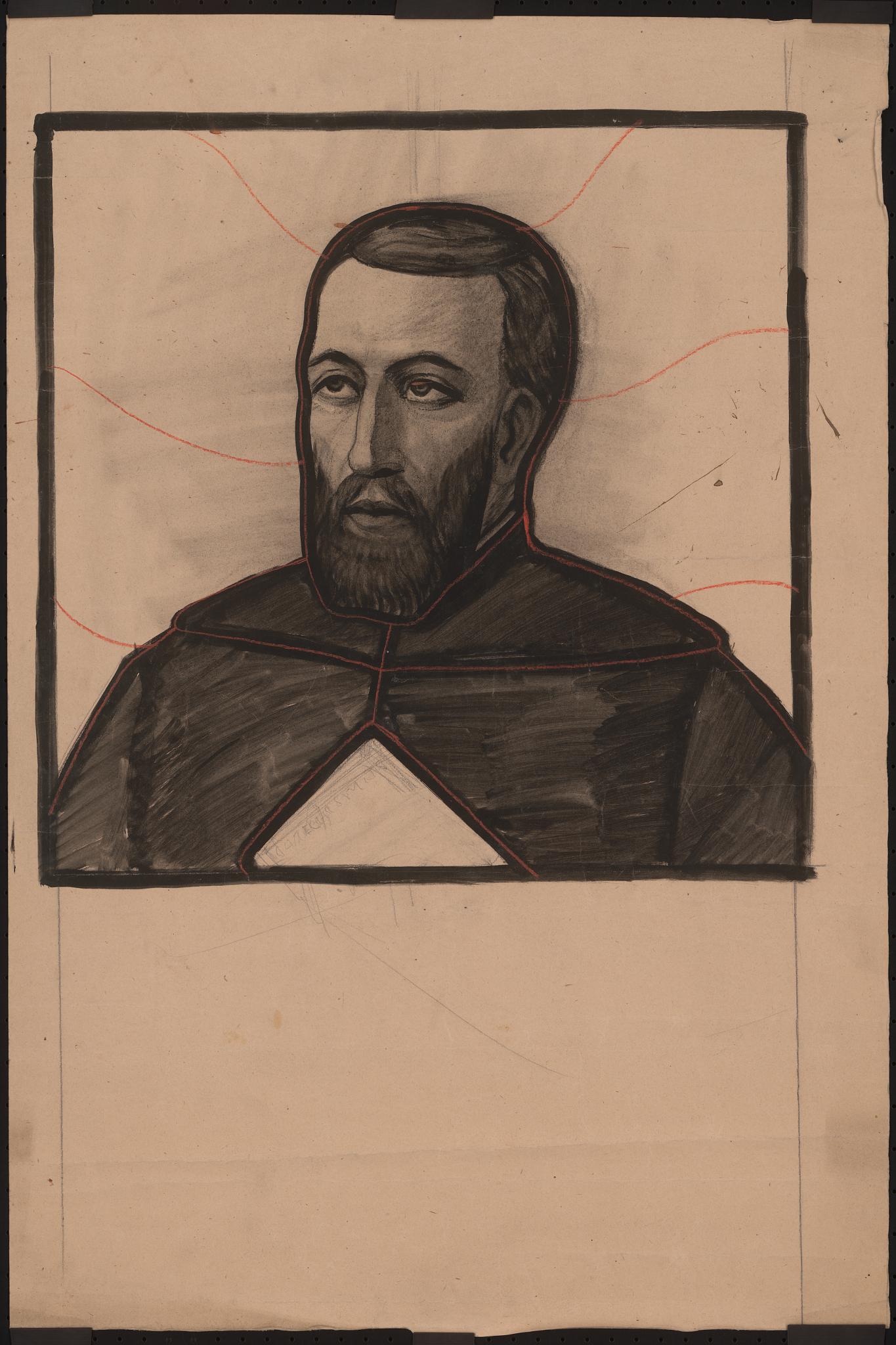 Ce carton est le modèle noir et blanc précis à l’échelle 1:1 de la partie supérieure figurée du vitrail consacré à saint Pierre Canisius pour la première fenêtre à gauche dans la nef de l’église Saints-Pierre-et-Paul à Villars-sur-Glâne.