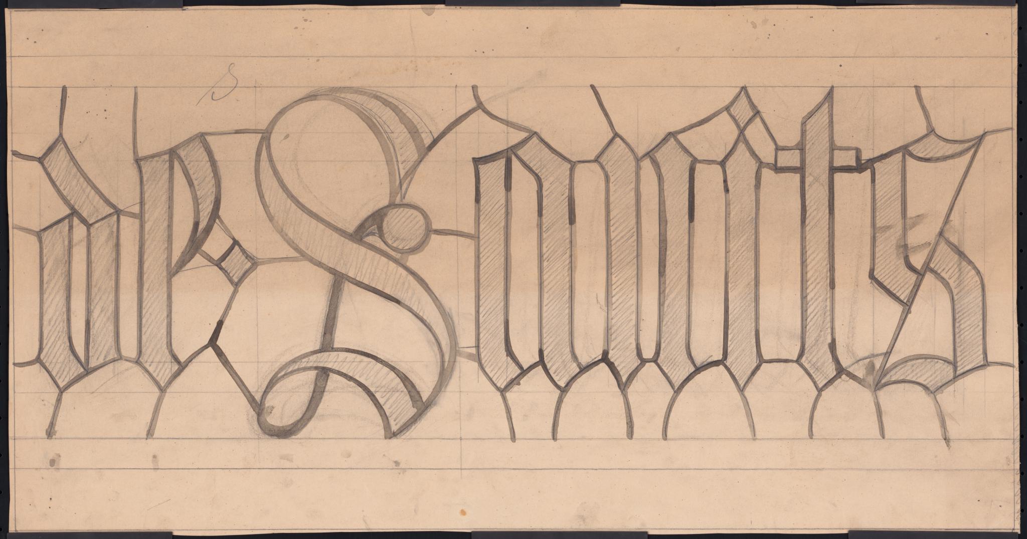 Inscription partielle en lettres gothiques pour le bas d'un vitrail. L’artiste a interverti les lettres “i” et “n”.