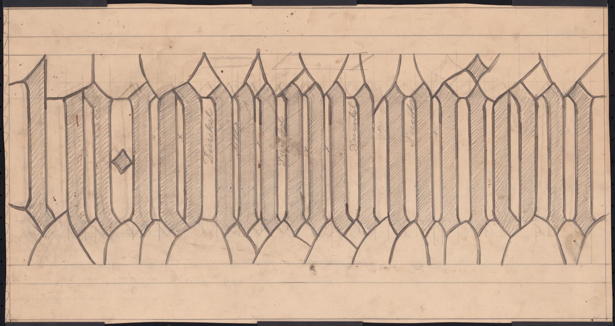 Inscription partielle en lettres gothiques, pour le bas d'un vitrail.