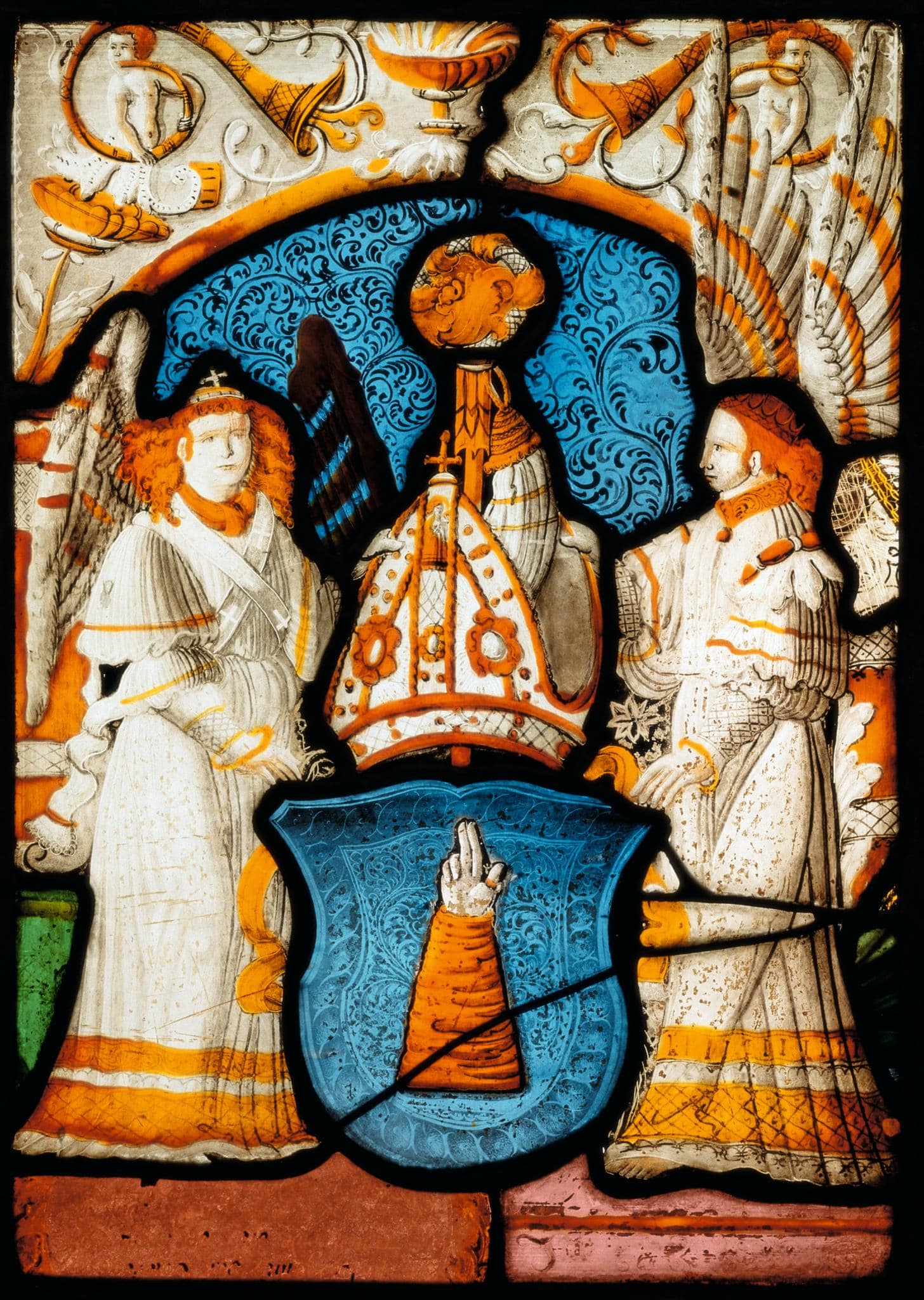 Vor blauem Rankendamast halten zwei Engel die Wappentartsche des Kapitels, die von der infulierten und mit dem Pedum durchsteckten Mitra überhöht wird. Beide tragen die lange weisse, mit goldenen Borten verzierte Albe mit modisch gebauschten Ärmeln. Der Engel links ist durch das über die Brust drapierte Kreuzband und ein Diadem auf den lockigen goldenen Haaren ausgezeichnet. Er hält den vorderen Teil des mit dem Muttergottesbild geschmückten und mit dem Kreuz besteckten Bischofshutes. Der rechte, im Profil dargestellte Engel legt die Hand an den rückwärtigen Teil der perspektivisch in Schrägansicht dargestellten Mitra. In den Zwickeln des auf gelben Säulen mit grünen Podesten ruhenden Bogens blasen zwischen einer trennenden Vase aus Blüten wachsende Putten in Hörner, aus denen Ranken herauswachsen. Am Fuss der Scheibe sind zwei unterschiedliche rosafarbene Inschriftfragmente anstelle der ursprünglichen Stifterinschrift als Flickstücke eingesetzt, wobei der linke Teil kopfunter steht.