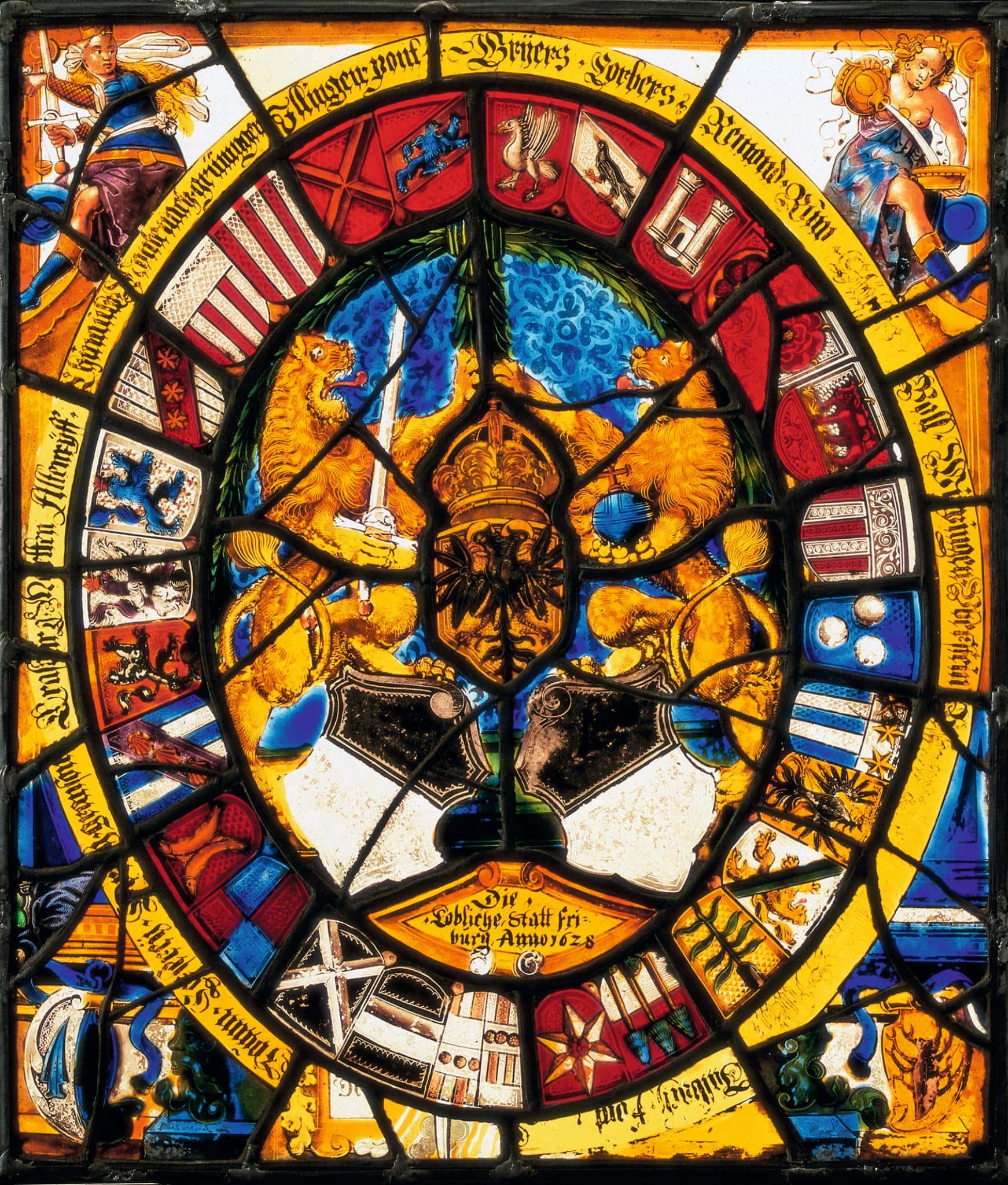 In einem Hochoval ist die Wappenpyramide des Standes Freiburg vor einem grünen Podest aufgebaut. Zwei Löwen treten mit dem Hinterlauf auf die geneigten Freiburger Schilde. Sie halten die Krone in der einen Pranke und in der anderen die Reichsinsignien, Schwert und Reichsapfel. Als Hintergrund dient ein blauer Rankendamast, den am Rand eine grüne Girlande schmückt. Vor dem Podium steht eine gelbe Kartusche mit der Stifterinschrift. Die Darstellung rahmt ein Fries mit 28 Ämterwappen, die an ihrem oberen Rand in einer gelben Leiste beschriftet sind. Den unteren Abschluss bildet eine Sockelzone, vor welche die Wappen Buman und Schröter mit blauen Bändern aufgehängt sind. In den oberen Zwickeln sitzen nach aussen gewandt vor der weissen, gelb eingefassten Grundfläche zwei weibliche Tugendallegorien. Links hält die Gerechtigkeit (Justitia) in violettem Kleid mit blauem Mieder das Schwert und die Waage in den Händen, rechts giesst die Mässigkeit (Temperantia) in blau-violett geschecktem Gewand, mit nacktem Oberkörper, Wasser von einem Gefäss ins andere.