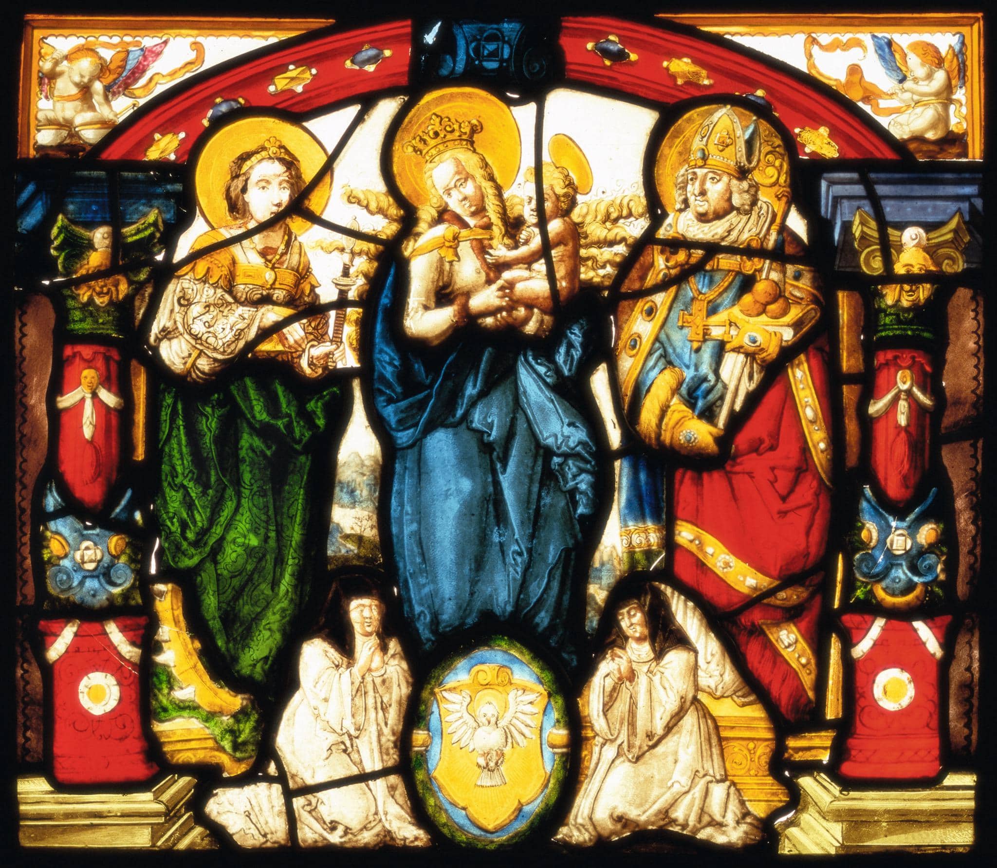 Vor einer besiedelten Seelandschaft steht die Muttergottes im Zentrum der Scheibe, begleitet von den Heiligen Katharina und Nikolaus. Über ihrem weissen Kleid mit pelzverbrämten Borten trägt die gekrönte Gottesmutter einen üppig gebauschten Mantel. Ihre blonden Zapfenzieherlocken stehen seltsamerweise fast waagerecht hinter ihren Schultern ab. In ihrem linken Arm trägt sie das nackte Jesuskind. Katharina trägt die Zeittracht mit dem breiten geraden Ausschnitt und den engen Schulterpartien, aber weiten Ärmeln des Kleides. Der gemusterte grüne Mantel, das Diadem (ergänzt) und die goldene Kette mit Medaillon zeugen von ihrer königlichen Herkunft. Das Buch in der Rechten haltend, umfasst sie mit der Linken das Schwert, das mit dem Rad zu ihren Füssen auf ihr Martyrium hinweist. Der hl. Nikolaus ist als imposanter Bischof in fortgeschrittenem Alter dargestellt. Er trägt zur Mitra die bischöflichen Gewänder: Albe, blaue Dalmatika und rotes Pluviale mit goldener, edelsteinbesetzter Borte. Auf der Brust hängt das goldene Pontifikalkreuz. In der Rechten trägt der Heilige das Buch und die drei goldenen Kugeln, in der Armbeuge das Pedum. Zu Füssen der Heiligen knien zwei Zisterzienserinnen im weissen Klosterhabit mit schwarzem Schleier. Die Hände im Gebet gefaltet, rahmen sie das lorbeerbekränzte Wappen des hl. Geistes. Die Rahmenarchitektur mit roten Säulen unter grünen Volutenkapitellen trägt einen flachen Bogen, über dem zwei Putten (ergänzt) musizieren. Eine Stifterinschrift, die auf die Herkunft oder den ursprünglichen Bestimmungsort der Scheibe hinweisen könnte, fehlt.