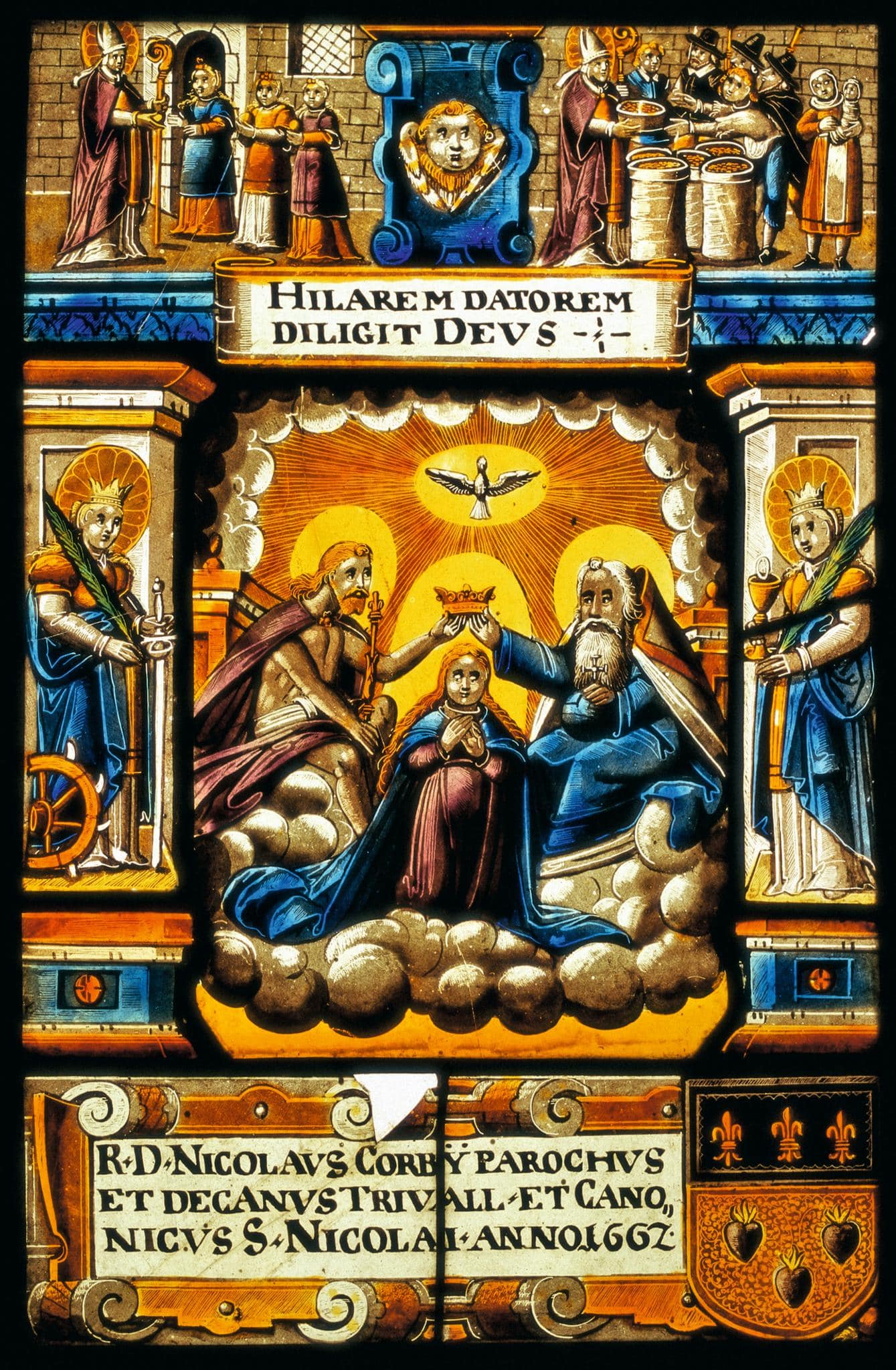 Im Mittelbild kniet Maria mit gefalteten Händen in violettem Kleid und blauem Mantel über den Wolken. Die thronenden Christus links in Lendentuch unter violettem Mantel und Gottvater in blauem Gewand und weissem Mantel halten die Krone über ihr Haupt. Darüber schwebt die Taube im Strahlenkranz. Links und rechts stehen vor steinfarbenen Pilastern die gekrönten Stadtheiligen: links die hl. Katharina mit Schwert und Palmzweig, das Rad zu ihren Füssen, rechts die hl. Barbara mit Kelch und Palmzweig. Beide tragen über dem weissen Kleid ein gelbes Gewand und einen blauen Mantel. Getrennt durch eine Volutenkartusche mit Puttenkopf sind über dem blauen Architrav Szenen aus dem Leben des hl. Nikolaus dargestellt. Links schenkt der Bischof den drei Schwestern die drei goldenen Kugeln, rechts verteilt er unter die Armen Geld. Sicher nicht zufällig lautet darunter die lateinische Devise des Stifters: “Gott schätzt den frohen Spender”. Am Fuss der Scheibe nimmt eine gelbe Rollwerkkartusche die Inschrift des Stifters auf. Rechts schliesst sich sein Wappen an.