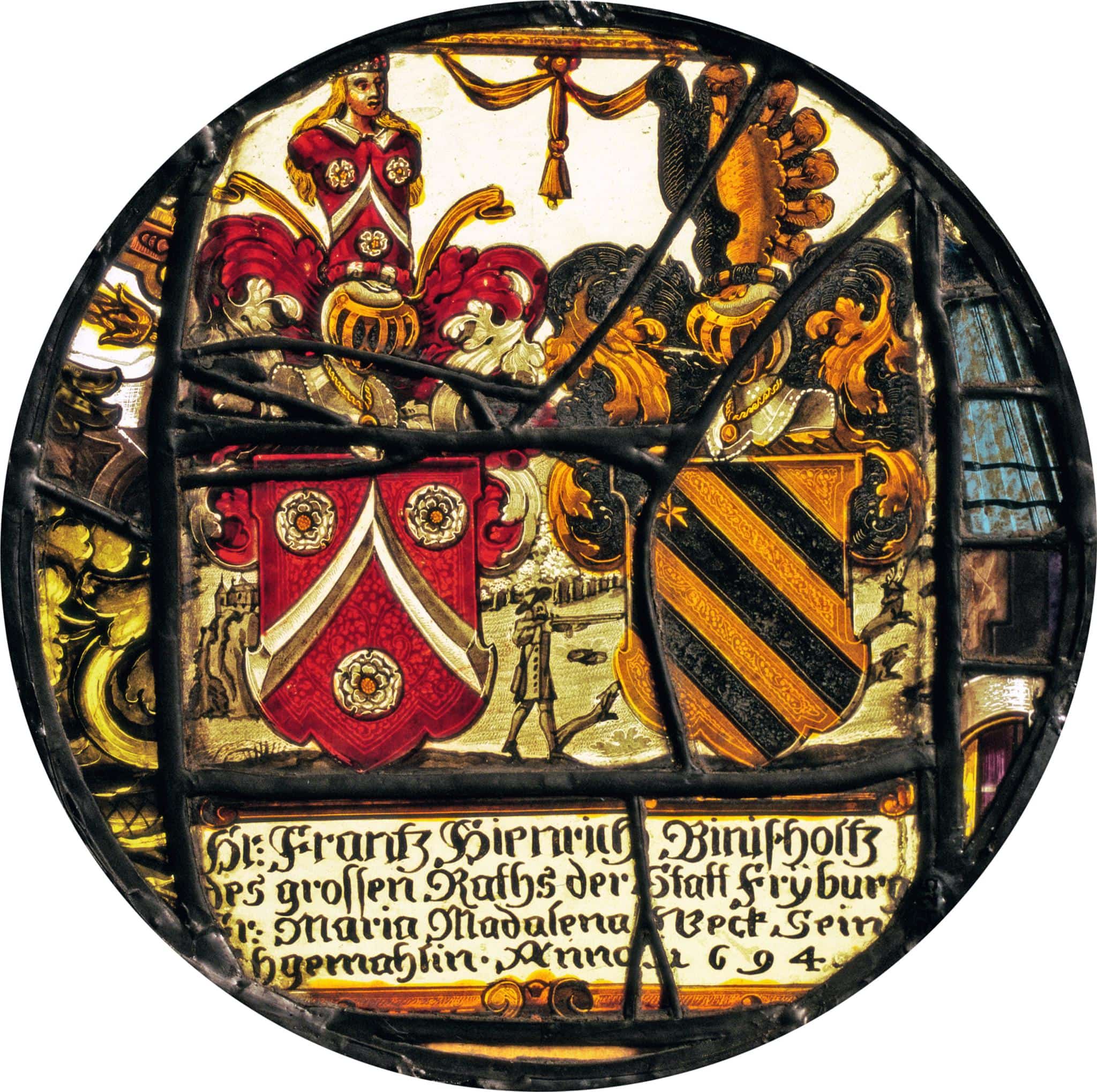 Stifterinschrift: Hr: Frantz Hienrich Binißholtz / des grossen Raths der Statt Frÿburg / Fr: Maria Madalena Weck Sein / Ehgemahlin. Anno 1694.