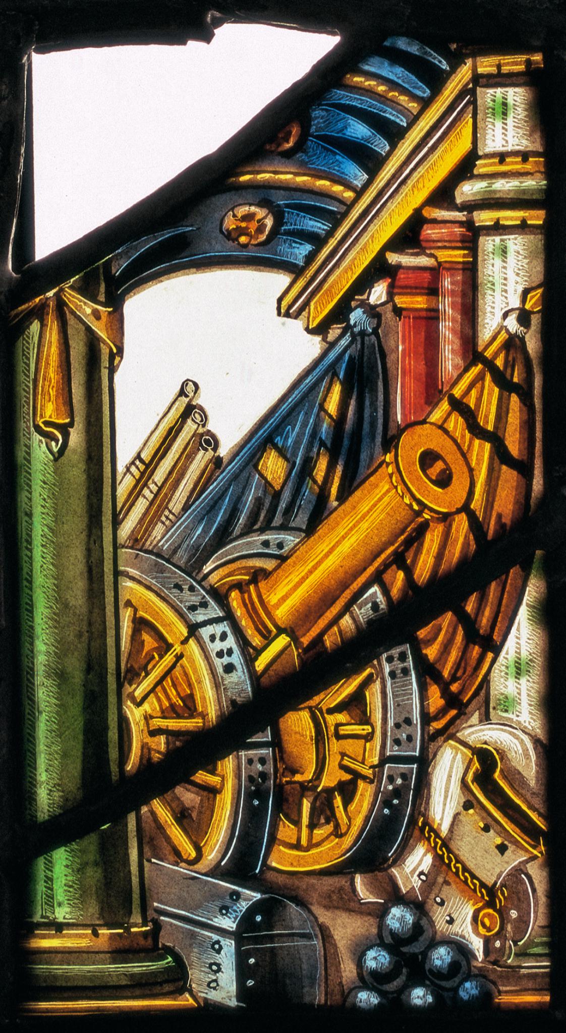 Unter einer perspektivisch fluchtenden Säulenhalle sind Banner, Truhe, Helm, Gewehrläufe, Kanonen und Kugeln zu einer imposanten Waffentrophäe aufgetürmt.