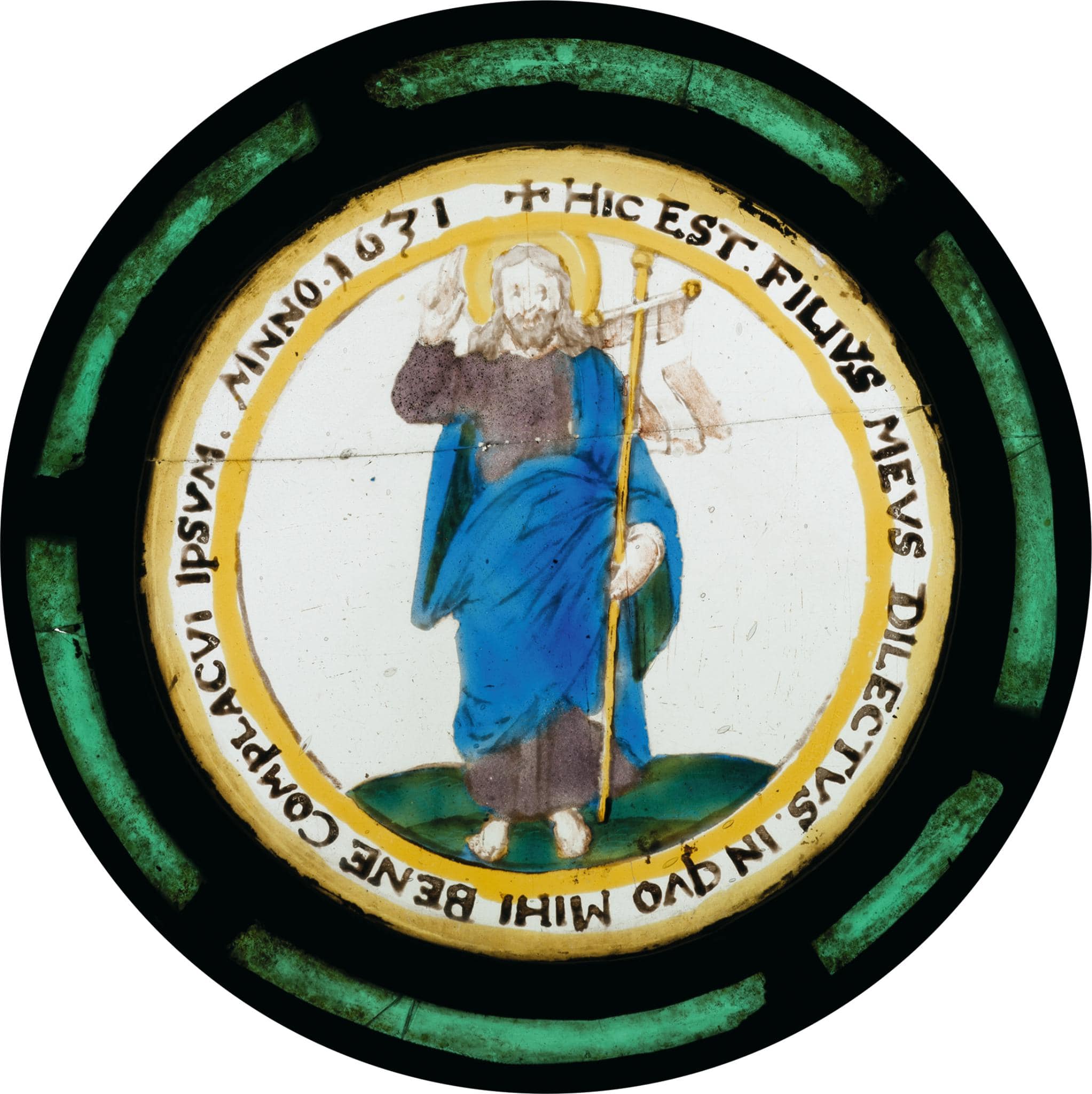 Die runde Monolithscheibe befindet sich in einer jüngeren Rahmung aus grünem Glas. Vor farblosem Grund steht auf einer Rasenbank Christus als Salvator. Er hält in der linken Hand das Triumphkreuz und spendet mit der rechten den Segen. Die figürliche Szene wird von einer lateinischen Inschrift mit dem Bibelzitat eingefasst: “Dies ist mein geliebter Sohn, an dem ich Wohlgefallen habe, ihn sollt ihr hören” (Mt 17, 5).