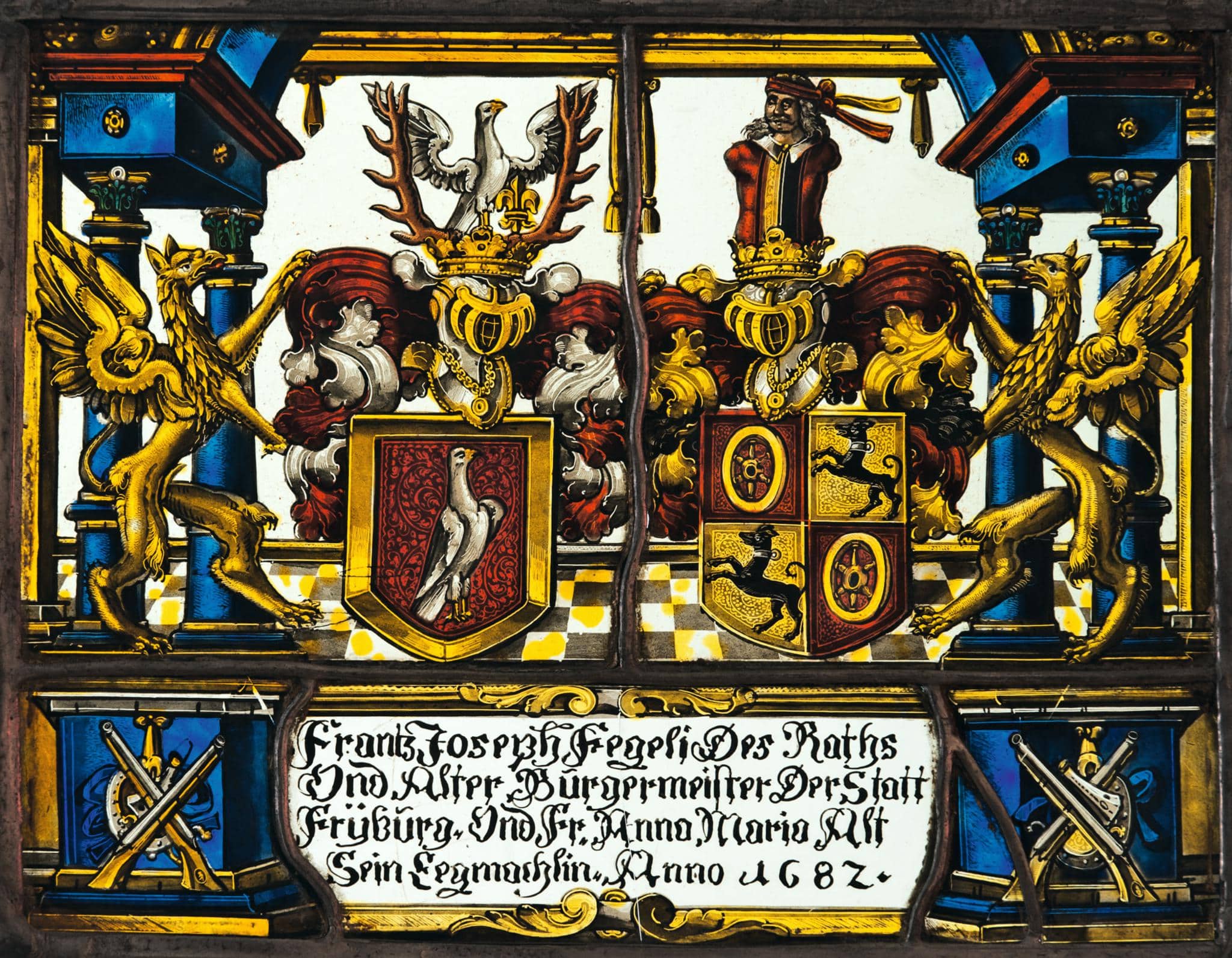 Stifterinschrift: Frantz Joseph Fegeli Des Raths / Vnd Alter Burgermeister Der Statt / Frÿburg. Vnd Fr. Anna Maria Alt / Sein Eegmachlin. Anno 1682.
