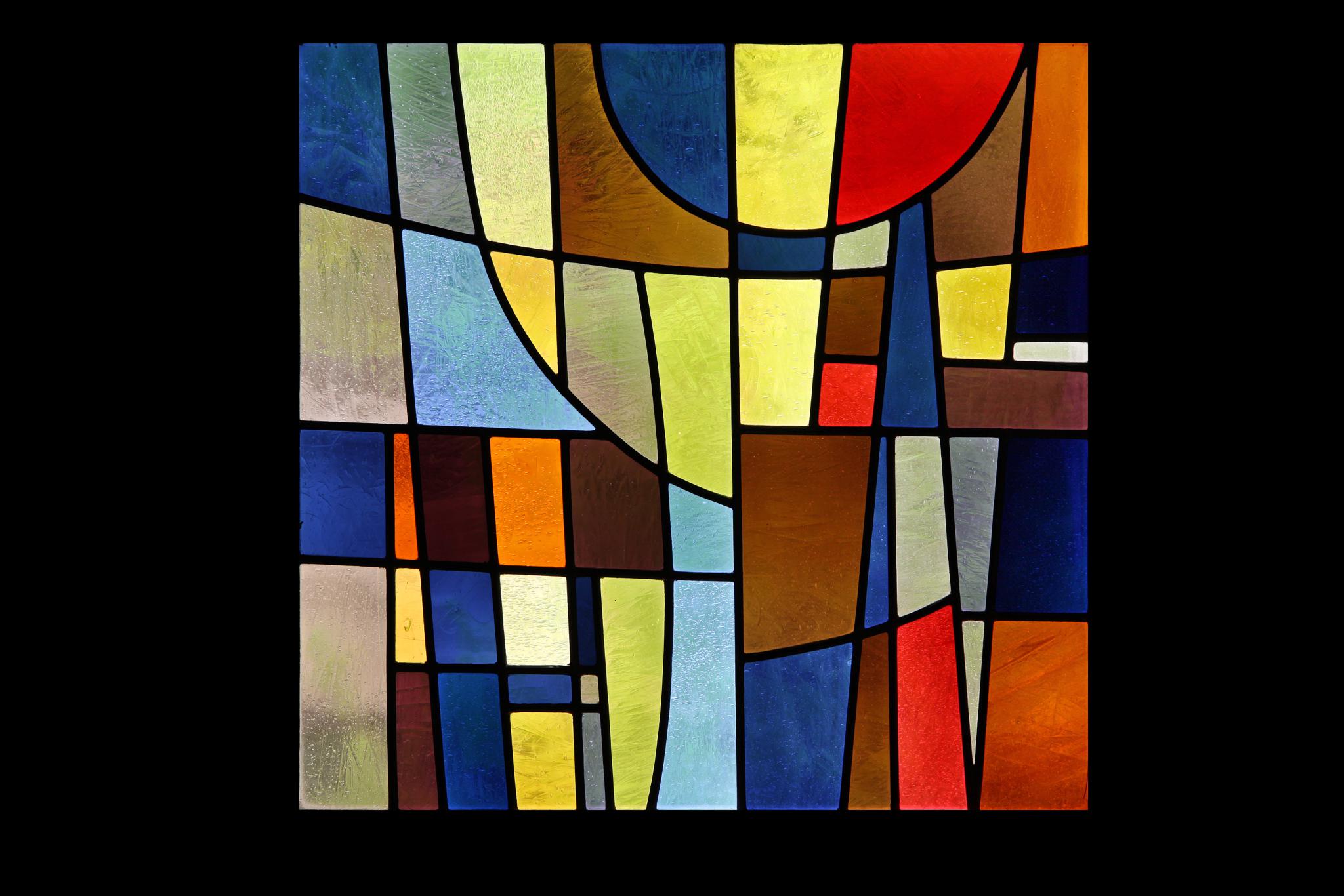 Vitrail non figuratif carré constitué de lignes et de courbes avec un demi-cercle en haut et de verres jaunes, bleus, oranges, beiges et bruns.