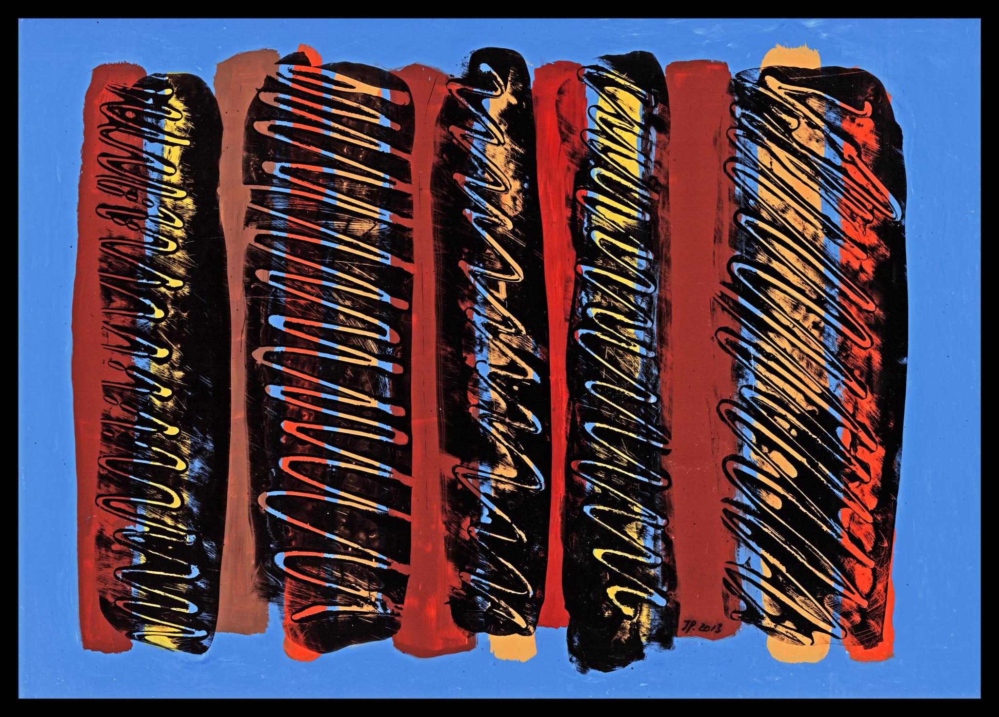 Maskierstift (nach dem Trocknen mit schwarzer Deckfarbe übermalte und weggerubbelt), umlaufender Randbereich blaue Deckfarbe, in mittleren Bereich mit Ölfarbe übermalt