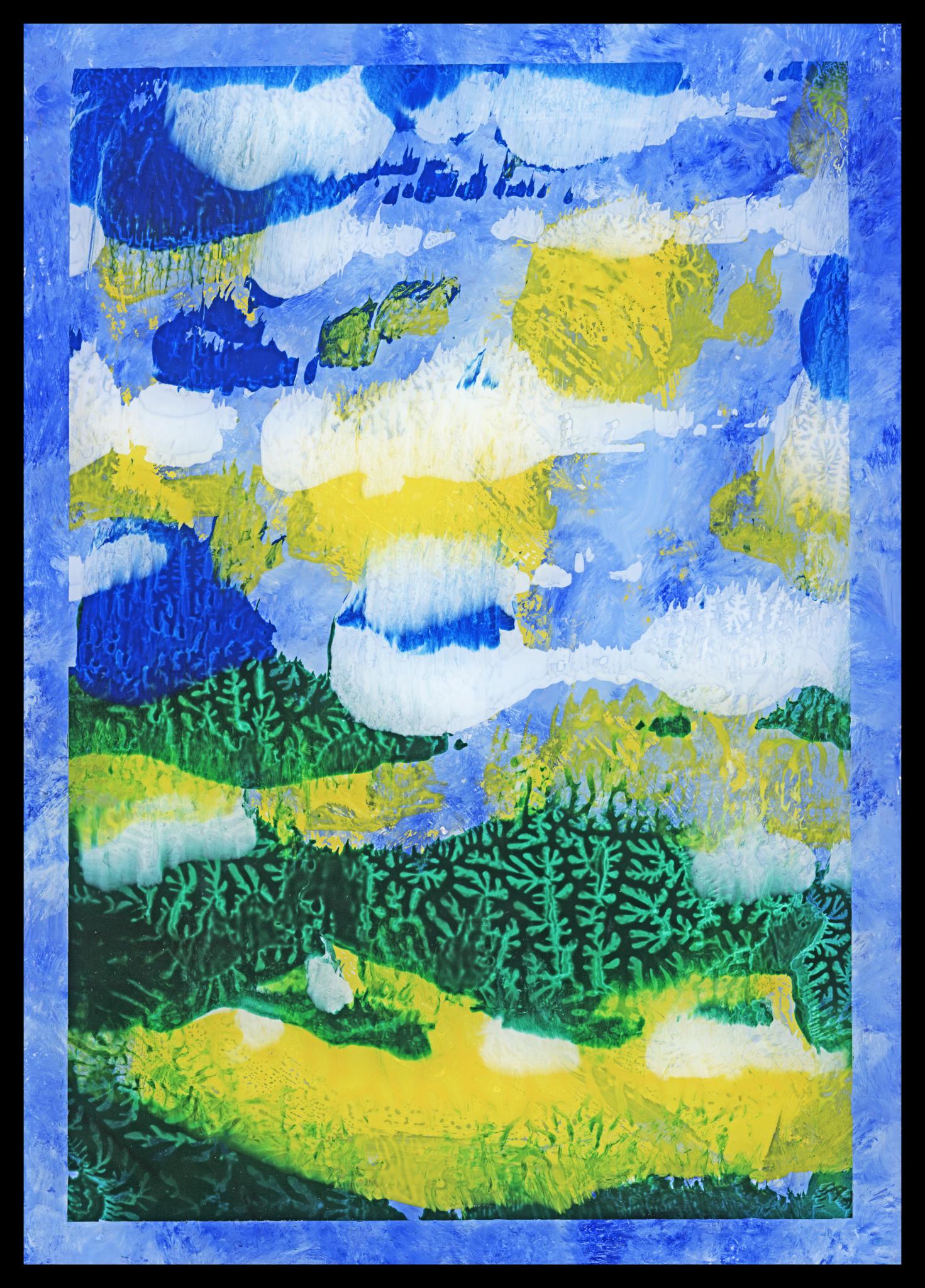 Rand Deckfarben, im mittleren Bereich In Abklatsch-Technik aufgebrachte Acryllacke, mit Deckfarbe übermalt