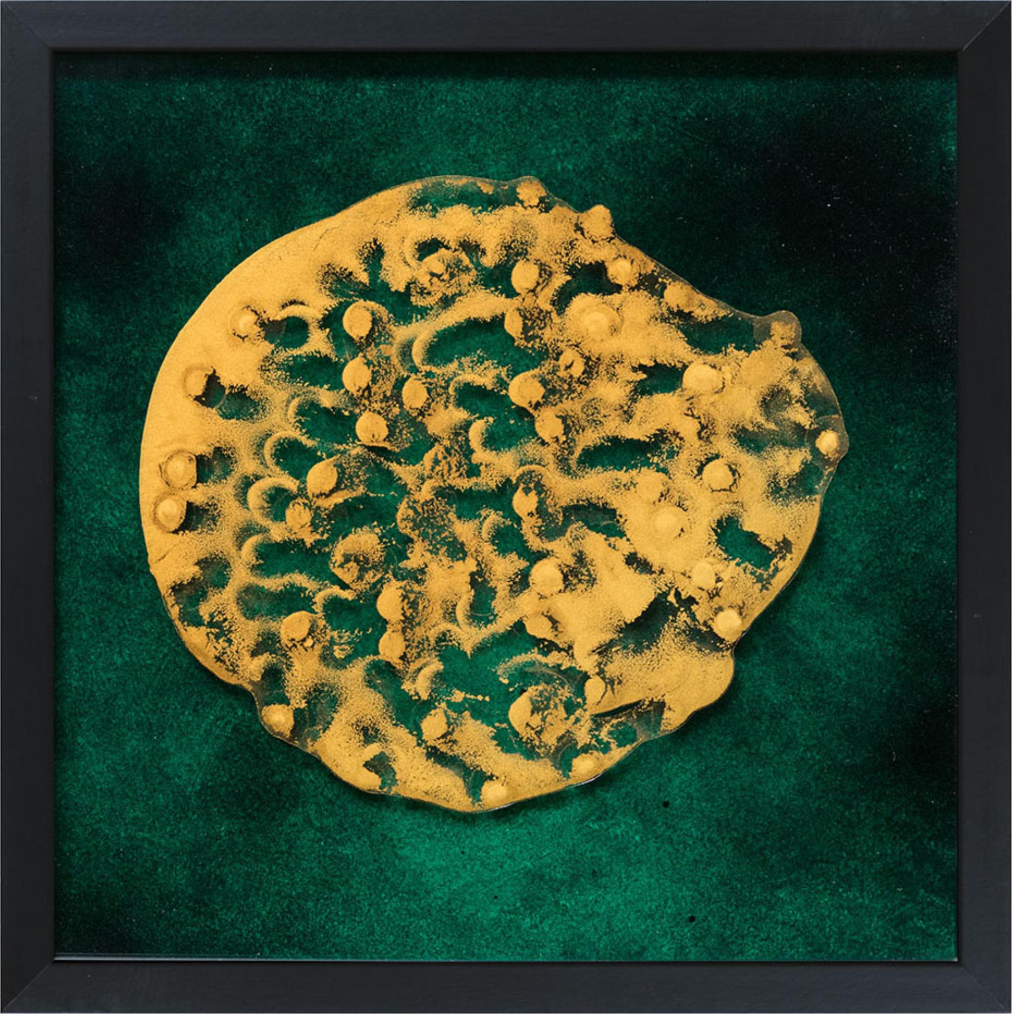 Interpretationsoffene Malerei. Das Hinterglasbild besteht aus zwei Glastafeln (Floatglas). Diese sind in einem Abstand von 5 mm hintereinandergestellt und durch eine schwarze Holzleiste getrennt. Dem Bild wird dadurch eine räumliche Tiefenwirkung verliehen.