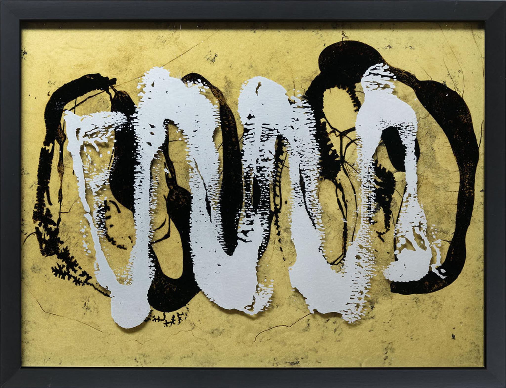 Auf der vorderen Glastafel silberne Metallglanzfarbe im Abklatschverfahren, auf der Vorderseite der hinteren Glastafel schwarze Deckfarbe im Abklatschverfahren, mit goldener Metallglasfarbe übermalt