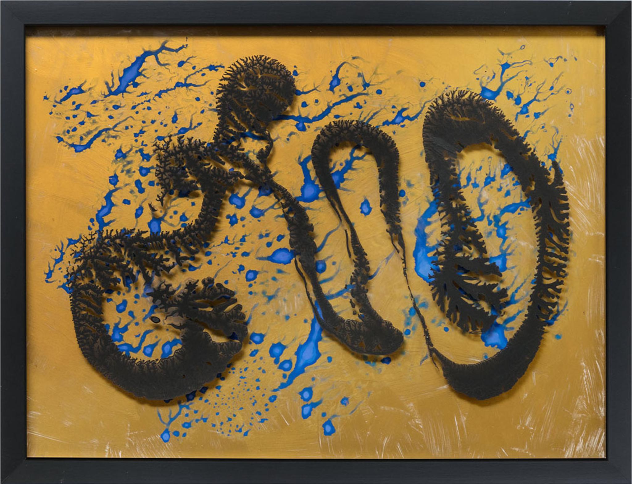 Auf der vorderen Glastafel schwarze Deckfarbe in Abklatschtechnik, auf der Vorderseite der hinteren Glastafel aufgespritzte blaue Deckfarbe, auf der Rückseite der hinteren Glastafel ganzflächig goldene Metallglanzfarbe