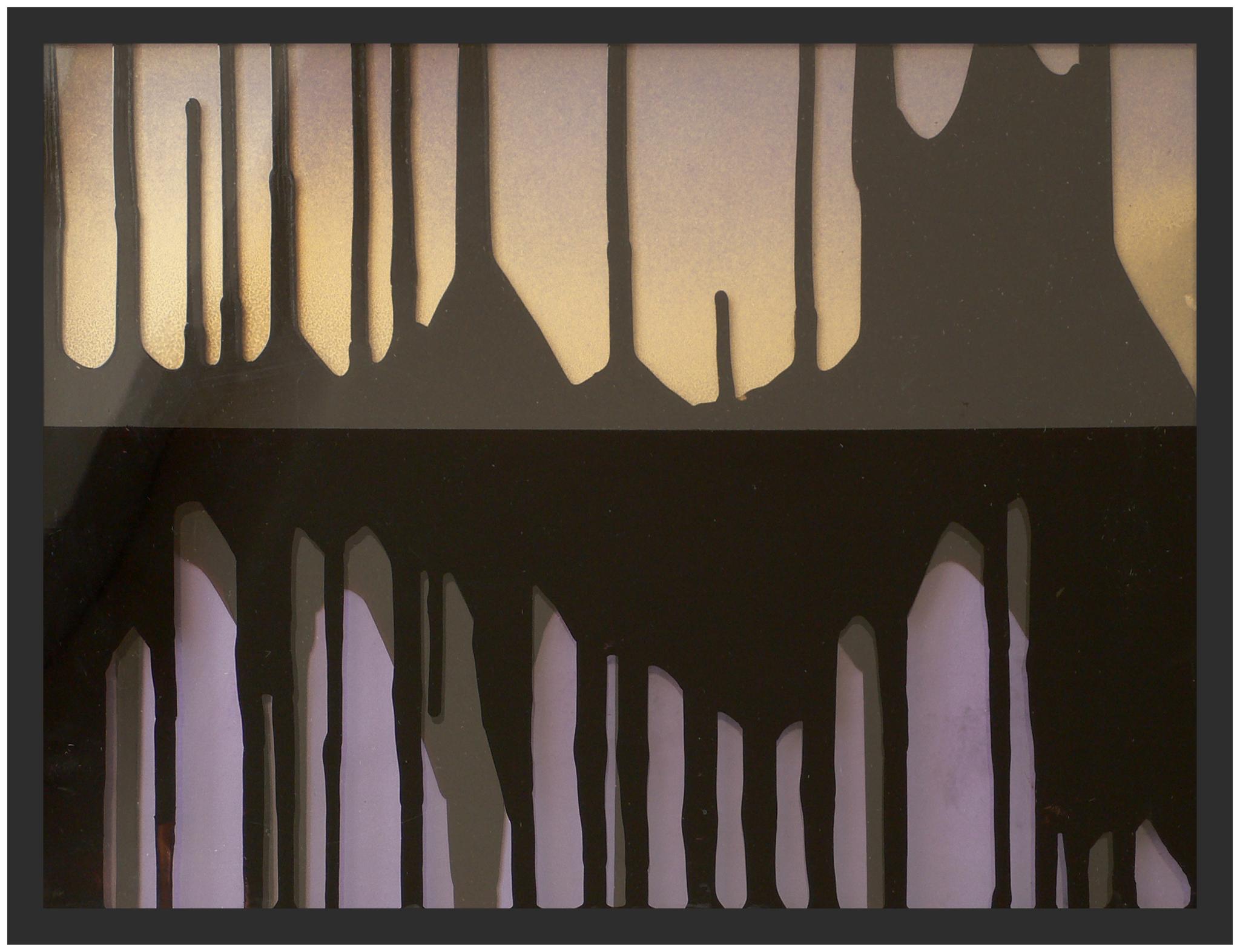 Auf der vorderen Glastafel im unteren Bereich aufgegossener Asphaltlack, vor dem Trocknen durch Bewegen der Glastafel gezielt zum unteren Bildrand verlaufen; auf der Vorderseite der hinteren Glastafel aufgegossener Asphaltlack, vor dem Trocknen durch Bewegen der Glastafel gezielt zum oberen und unteren Bildrand verlaufen; auf der Rückseite im oberen Bereich goldener Sprühlack, im unteren Bereich violette Deckfarbe