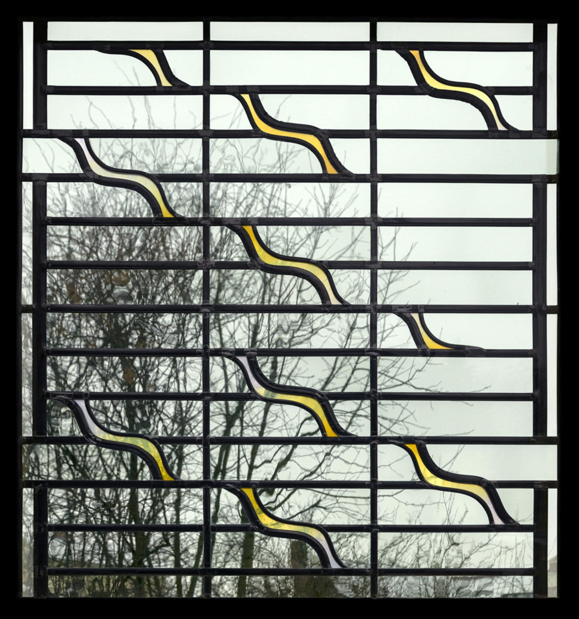 Probefeld einer ornamentalen Verglasung mit Rasterstruktur aus waagerechten Rechtecken: gelbe schräg angeordnete Wellenmotive bringen Dynamik in die Blankverglasung.