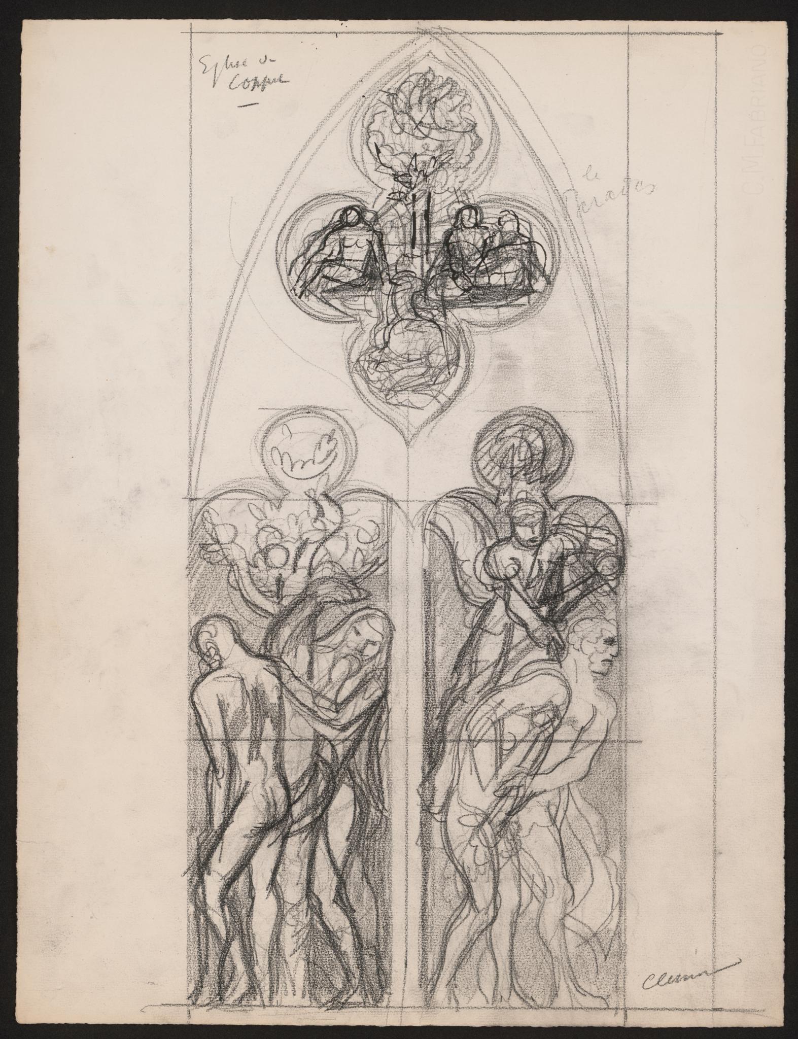 Clément a réalisé une première maquette pour ce vitrail, le CHC_045. Sur cette seconde, il reprend les mêmes dessins avec plus de précisions. Il est très instructif de les mettre en parallèle afin de voir comment le sujet a évolué. Il semble que l’artiste ait rapidement fixé les deux épisodes liés à Adam et Eve, à l’exception de petits détails qui ont évolué. Par contre, l’illustration dans le quadrilobe de la partie supérieure du vitrail semble avoir donné plus de peine à l’artiste. Deux variantes très différentes ont été imaginées. Pour la maquette CHC_045, Adam et Eve, debout côte à côte, sont figurés sur le lobe supérieur et l’agneau et le lion sont à leurs pieds dans les lobes gauche et droit. Pour le présent dessin, c’est le pommier qui prend place dans le lobe supérieur avec Adam et Eve assis de chaque côté de celui-ci. Seul l’agneau, couché, figure dans le lobe inférieur.
