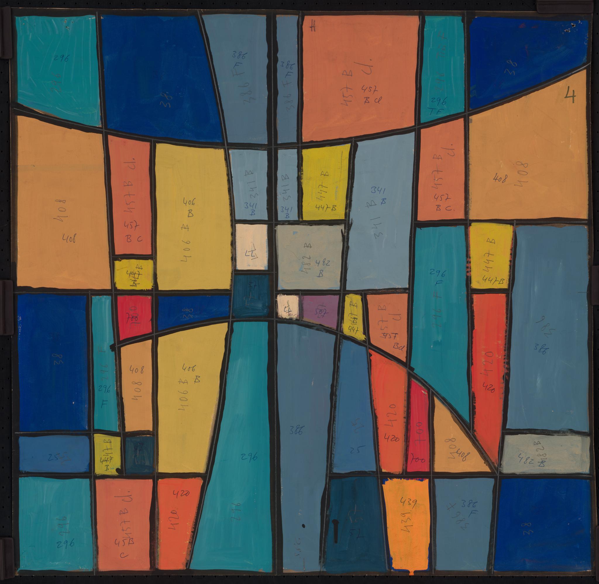 Ce carton de Bodjol est le projet définitif pour l'une des vingt verrières (GE_172.04) commandées en 1983 à l’artiste par Jean-Jacques Buard, alors pasteur de la paroisse protestante de Cointrin-Avanchet, pour orner les dix paires de fenêtres carrées du Centre communautaire oecuménique d'Avanchet. Celui-ci a été vendu en 2016 par les églises protestante et catholique à l’église pentecôtiste, qui a déposé l’ensemble des verrières, sauvé in extremis par l’Association pour la Promotion de l’Art Sacré (APAS) (Buard, 2018). La même année, six verrières ont été offertes par l’APAS à la chapelle des Crêts au Grand-Saconnex, dont celle correspondant à ce carton, deux en 2017 au Vitromusée Romont, et cinq à la paroisse protestante d’Anières en 2018. Sept verrières, sont encore propriété de l'APAS et pourraient être offertes à d'autres paroisses qui souhaiteraient orner leur sanctuaire d'une ou plusieurs de ces verrières.