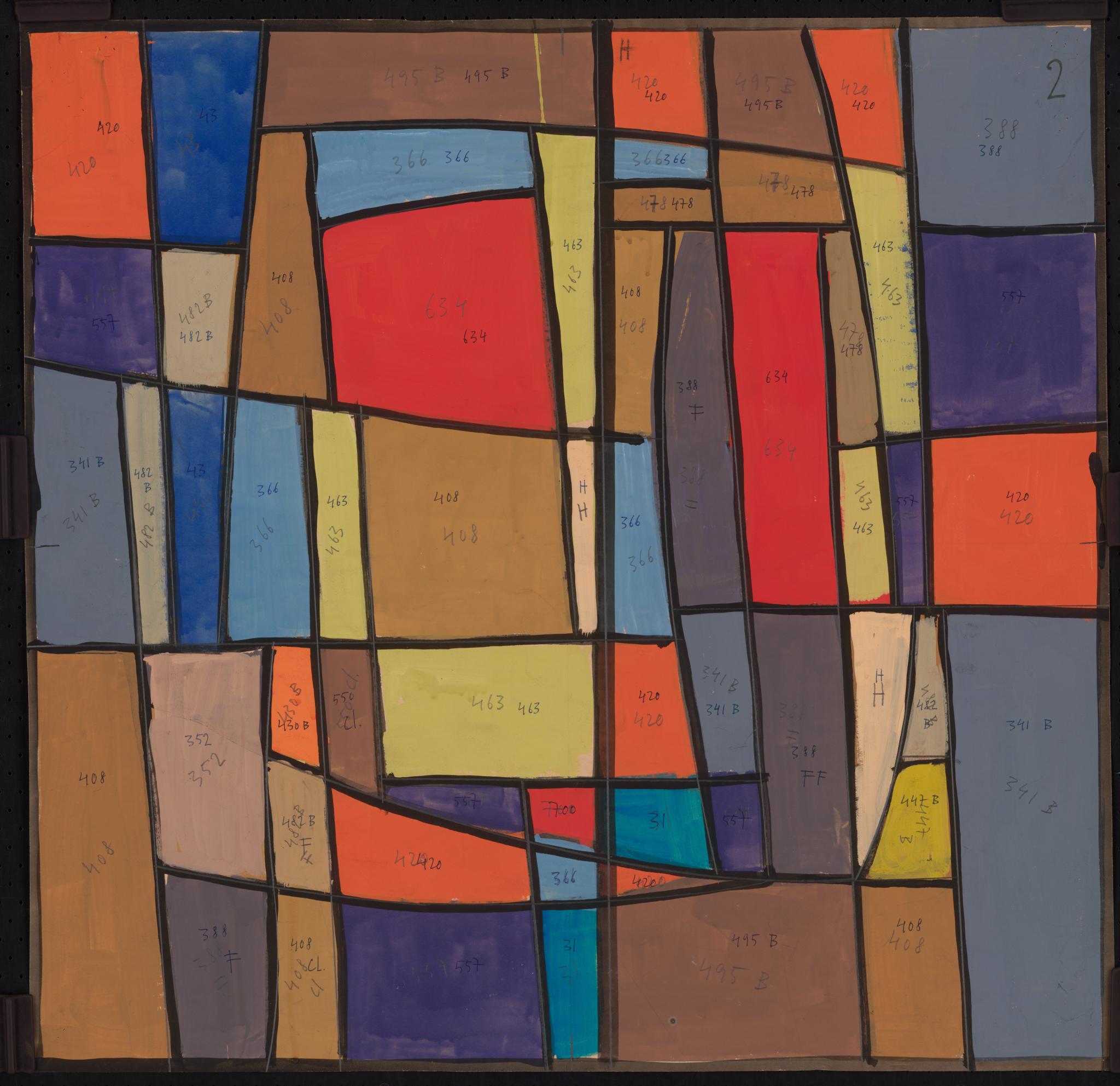 Ce carton de Bodjol est le projet définitif pour l'une des vingt verrières (GE_62.06) commandées en 1983 à l’artiste par Jean-Jacques Buard, alors pasteur de la paroisse protestante de Cointrin-Avanchet, pour orner les dix paires de fenêtres carrées du Centre communautaire oecuménique d'Avanchet. Celui-ci a été vendu en 2016 par les églises protestante et catholique à l’église pentecôtiste, qui a déposé l’ensemble des verrières, sauvé in extremis par l’Association pour la Promotion de l’Art Sacré (APAS) (Buard, 2018). La même année, six verrières ont été offertes par l’APAS à la chapelle des Crêts au Grand-Saconnex, deux en 2017 au Vitromusée Romont et cinq à la paroisse protestante d’Anières en 2018, dont celle correspondant à ce carton. Sept verrières sont encore propriété de l'APAS et pourraient être offertes à d'autres paroisses qui souhaiteraient orner leur sanctuaire d'une ou plusieurs de ces verrières.