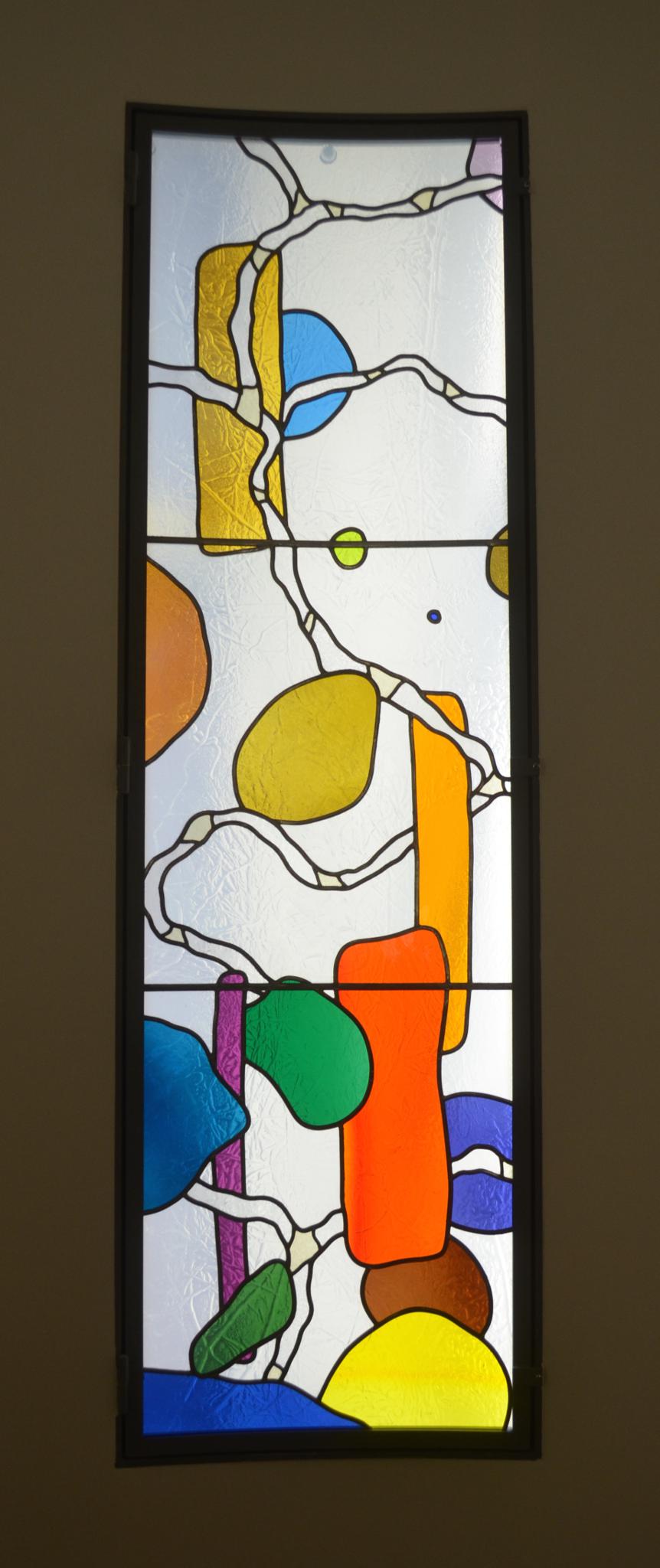 L’ensemble de ces quatre verrières imaginé par l’artiste fribourgeois Pascal Moret est très intéressant techniquement. La pièce de recueillement étant en arc de cercle, il a choisi de faire des vitraux bombés. Ce ne sont pas des verres plats avec une courbure faite par les plombs mais des verres eux-mêmes bombés. Ceux-ci l’ont été grâce à la technique du thermoformage sur moule. Le vitrail a été doublé à l’arrière-plan par un verre industriel (verre à vitre) de 8mm d’épaisseur qui lui aussi a été bombé et thermoformé avec des empreintes de végétaux.