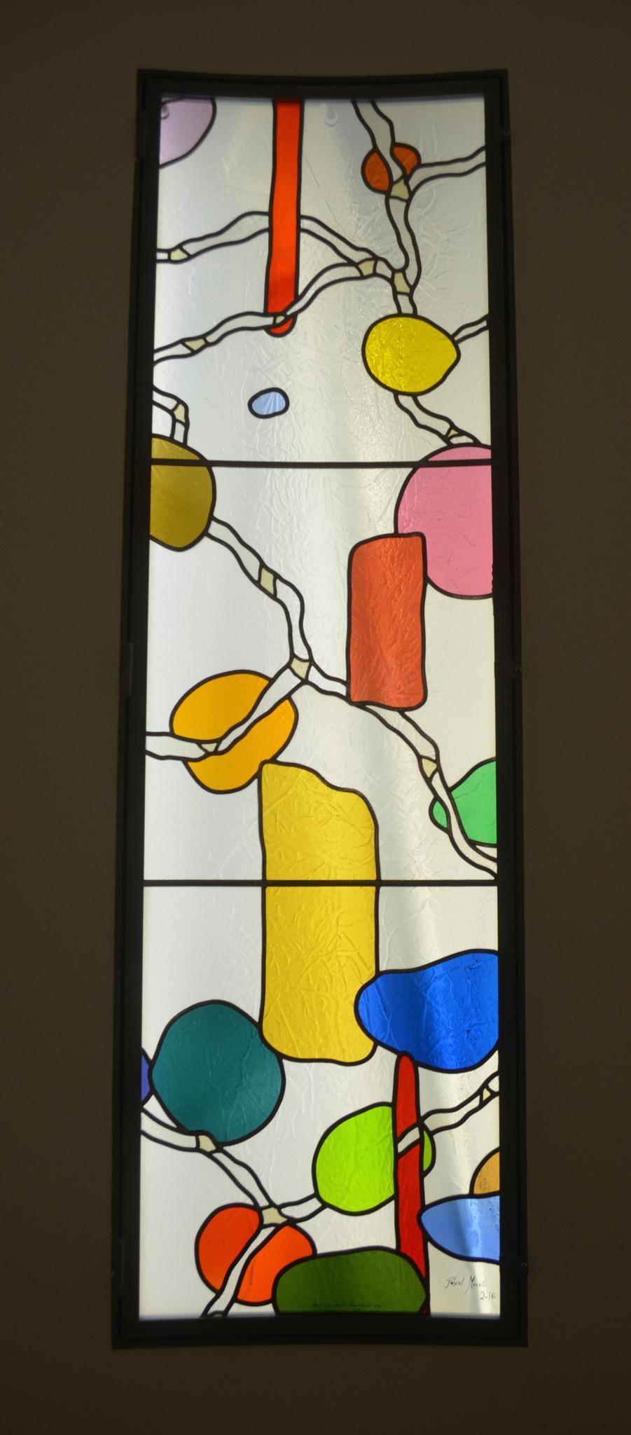 Vitrail abstrait composé de taches de couleurs de différentes grandeurs et teintes (jaune, orange, rouge, bleu, vert) sur un fond blanc. Des lignes courbes entourées de plomb se déploient sur l’ensemble du vitrail.